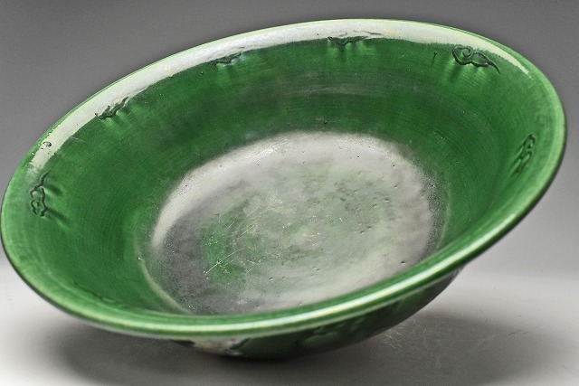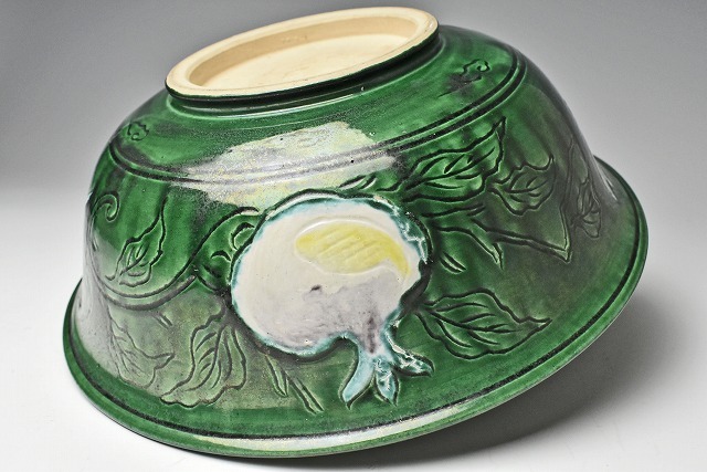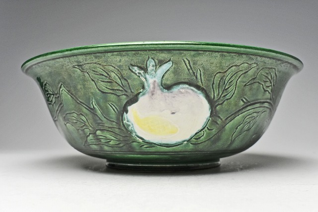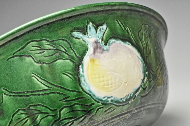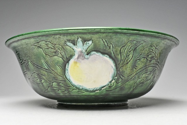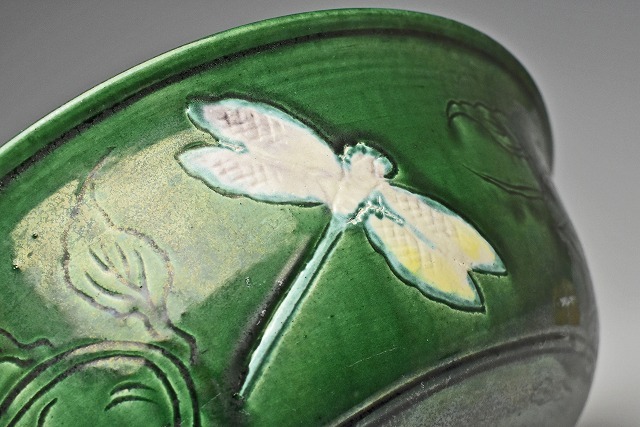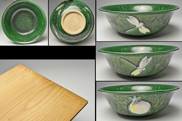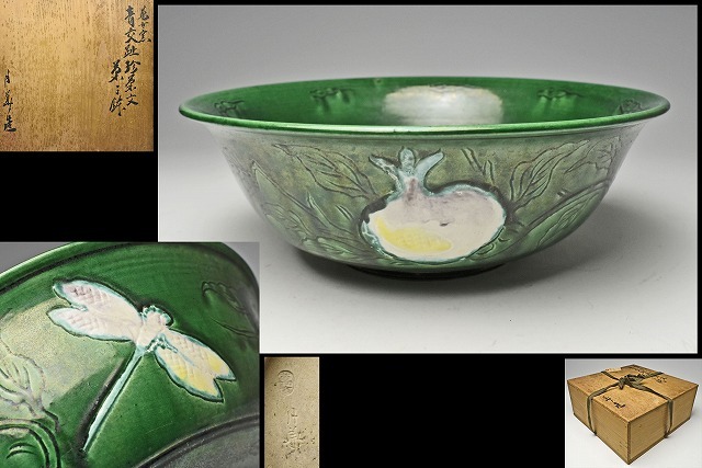 物故巨匠 加賀月華 氏の 作品です。 深みのある 緑釉が 古格を感じさせ 胴の 珍果 と トンボ文が 唐物を 思わせる 逸品です。 箱蓋の 桟が 取れています。 共箱に汚れ・シミがあります。