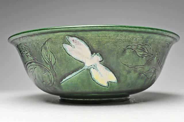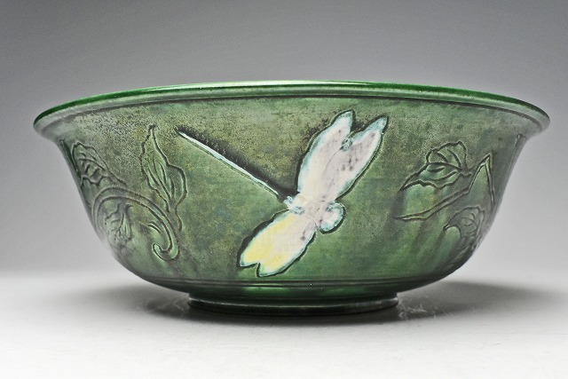 加賀月華 ★ 青交趾珍果トンボ文菓子鉢 ★ 共箱 ★ 茶道具 ★ 桑名 萬古焼 万古焼 ★