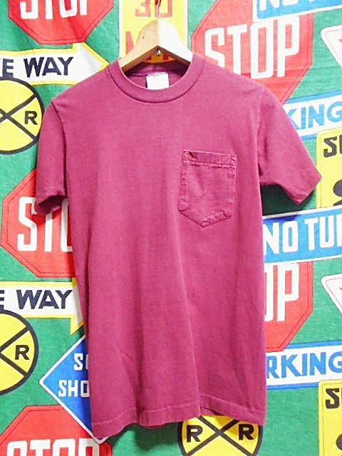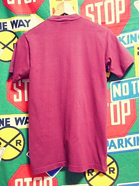 ボディーはコットン100%、エンジ系の色目も良い雰囲気で、ポケットの四角形ステッチが施されており、おおよそS~Mくらいのサイズ感をお探しの方にオススメなビンテージTシャツです。
