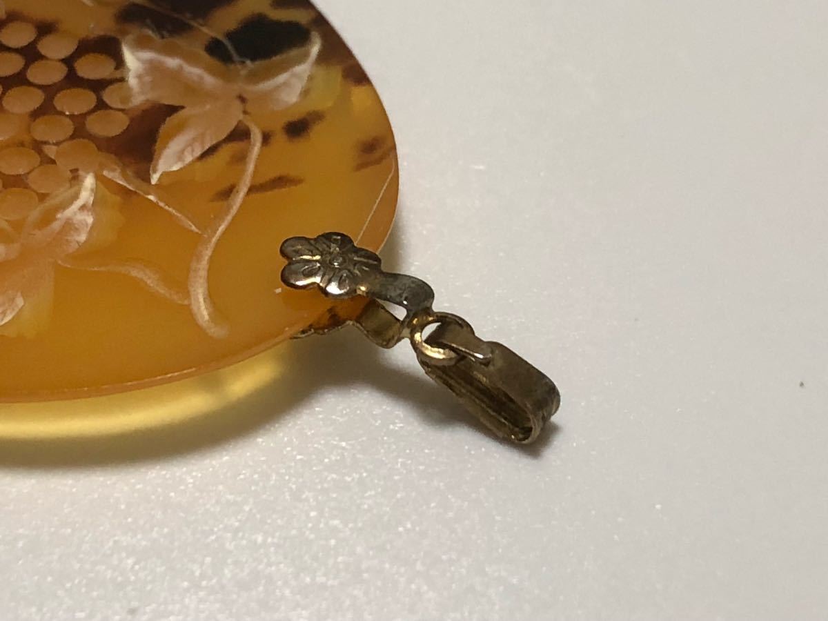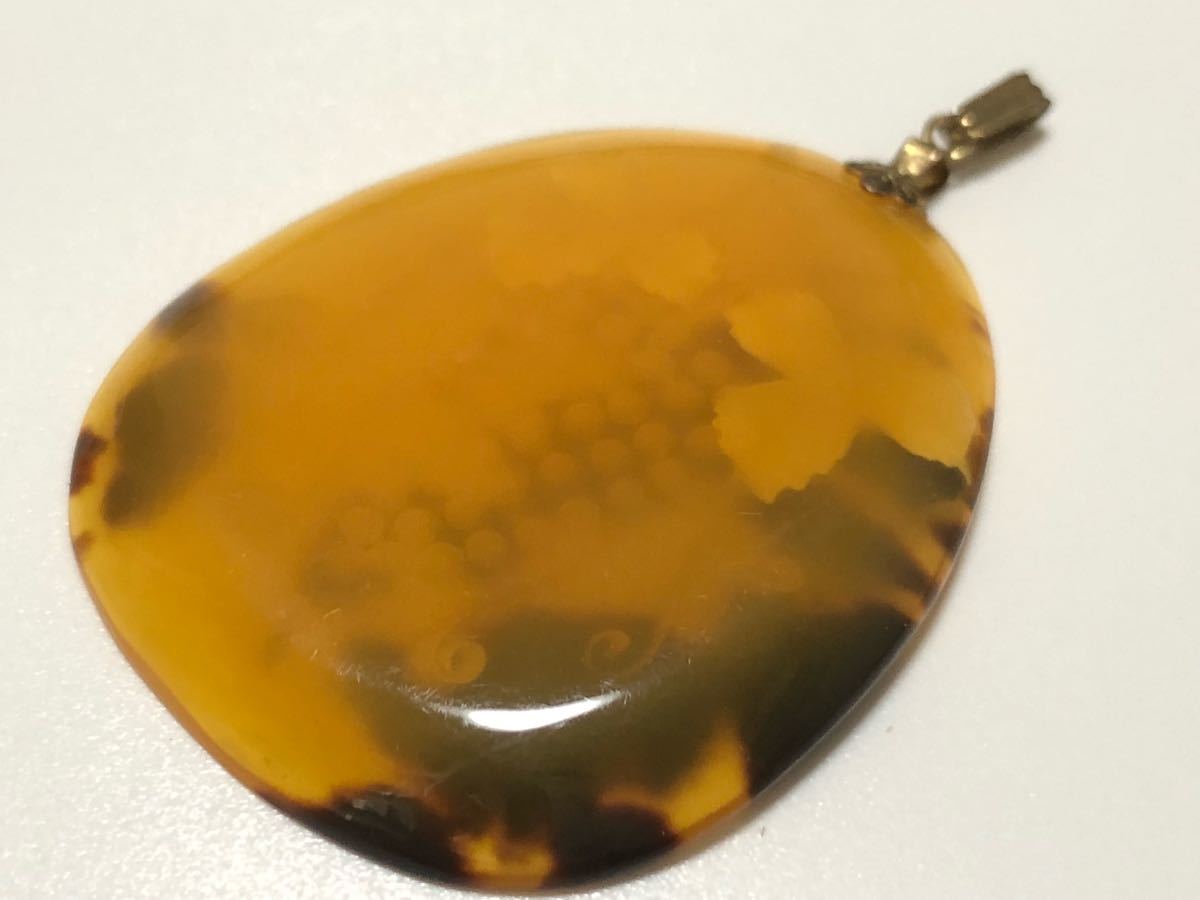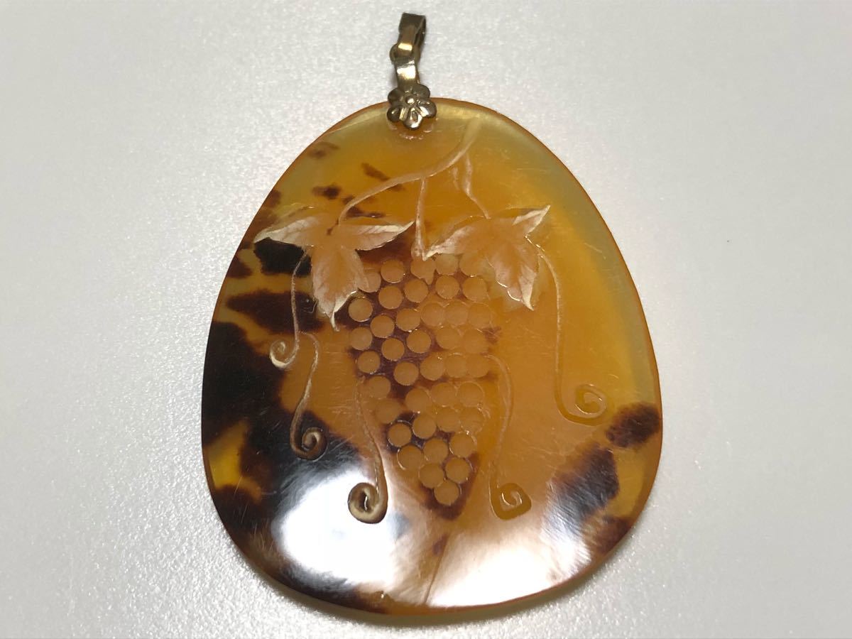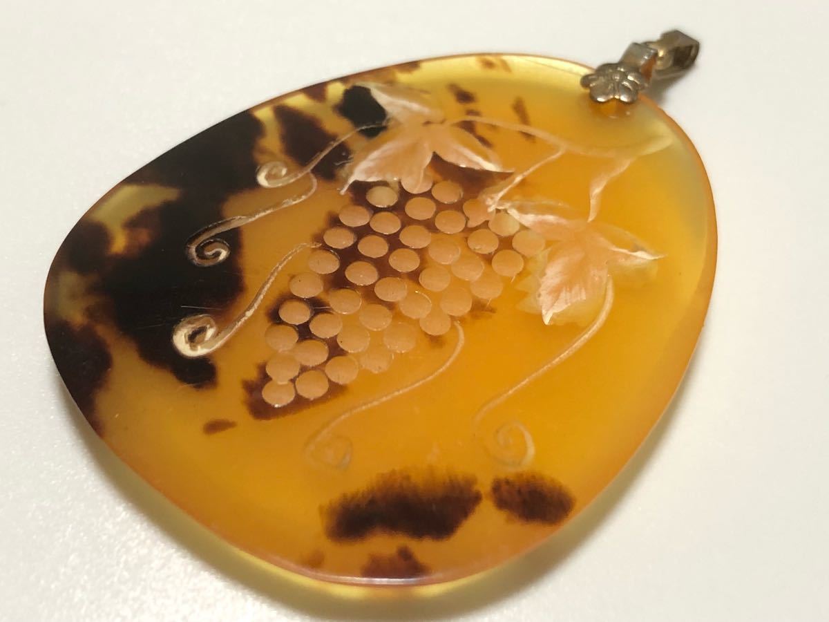 鼈甲張を使用し、葡萄細工を施した、ドロップ形のペンダントトップです。鼈甲部分に虫食いはありません。金属面に色あせがあります。