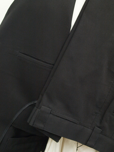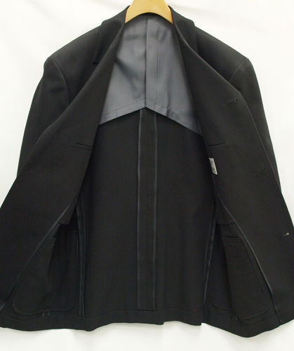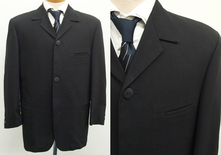 【サイズ】 M (Y5号サイズ相当) 目安の体型 身長165cm~175cm、ウエストサイズ76cm前後 【ジャケット実寸】 肩幅49cm 着丈73cm 袖丈58.5cm 脇下部分55cm 身幅50cm 【パンツ実寸】 ウエスト(胴回り実寸)76cm わたり幅31.5cm 股下10cm部分29.5cm 裾幅22.5cm 脇股上28cm 前股上32.5cm 股下86cm(裾上げしていない状態) 【素材】 表地:綿100% 裏地:胴裏/ポリエステル100% 袖裏/ポリエステル100% ゴワゴワした感じのカタメでハリがあるやや厚手のコットン素材を使用 【色】 黒色 【柄】 こまかい織柄入り 【デザイン】 ゆとりのある着心地のカバーオールタイプシングル3つボタンスーツ、新品。 ・ジャケットはシングル3つボタンでレギュラーフィット、普通のスーツの上着と違いカバーオールジャケットタイプです。 ・パンツは股上は浅くなく普通で、適度なゆとりをもたせたレギュラーフィット、ノータックパンツ 秋口~冬~春先にかけて秋冬シーズンに対応致します。 【縫製仕様】 ・ジャケットはシングル3つボタン、バルカラー、フラップなしポケット、袖口ボタン2つ、ノーベント、内ポケット2つ、背抜き(秋冬物) ・パンツはノータック、膝裏当てなし、縦付けポケット、後ろポケット左のみボタン付き、フロントはファスナーでボタン仕様/うちかけボタンあり きちんとしたビジネス仕様の縫製仕立てで仕上がっております。
