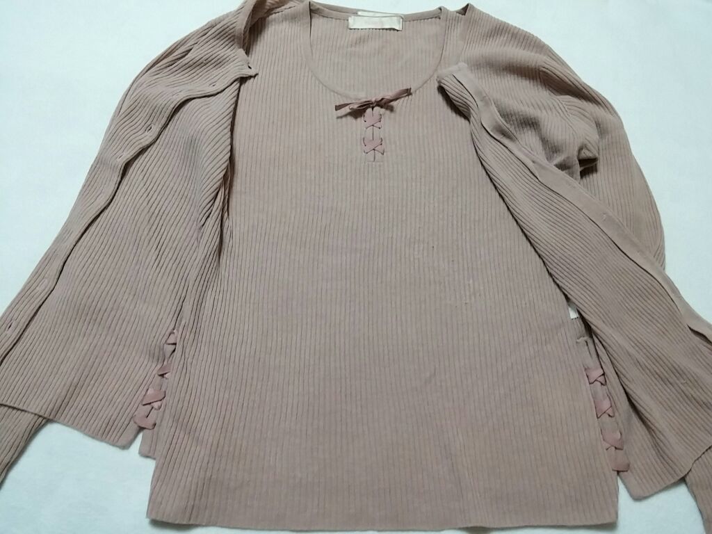💗こちらカットソーとアンサンブルのお品です🎶 カットソーも出品中ですので宜しければ覘いてみて下さい。 シミ等は無いと思いますが、前面にスレ?少しの毛玉が あります事ご了承願いますm(__)m 💗サイズ💗M W約40㌢×H約55㌢ ※素人採寸の為、多少の誤差はお許し下さいm(__)m 👂ご不明な点がありましたら、遠慮なく質問下さい。 📦 | |||