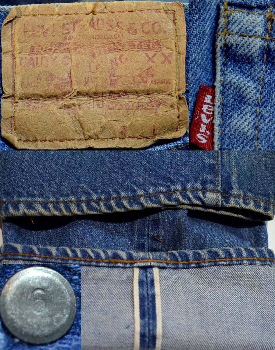 501の66後期です。復刻、レプリカではありません。『ディテール紹介』バックポケット裏チェーンステッチ、フロントトップボタン裏の刻印6、裾オリジナルチェーンステッチ。『状態』リペア= モモ、ヒザなど計3個、全く目立たない小さなリペアがあります。ボタンホール4つに補強があります(こちらも目立ちません)。その他=スレ、傷などUSED感がありますが、生地はしっかりしており、 年代を考慮すると良いコンディションだと思います。『色落ち、特徴など』 程度良好・超ロングレングスの501 66後期です。ミデュアムカラーでモモを中心に綺麗な縦落ちも入り、66らしい良い雰囲気だと思います。 合わせやすく、穿きやすい66後期です。気兼ねなくガンガン穿いてください。