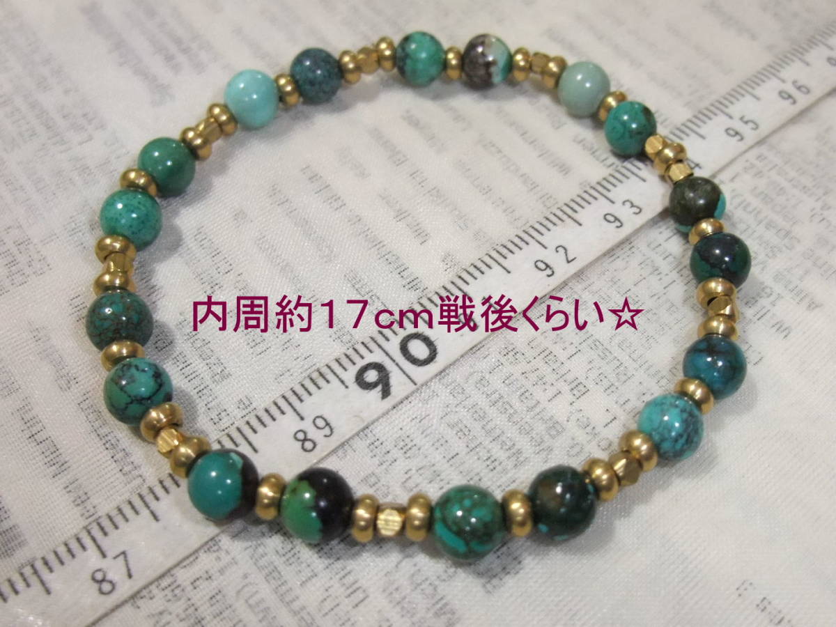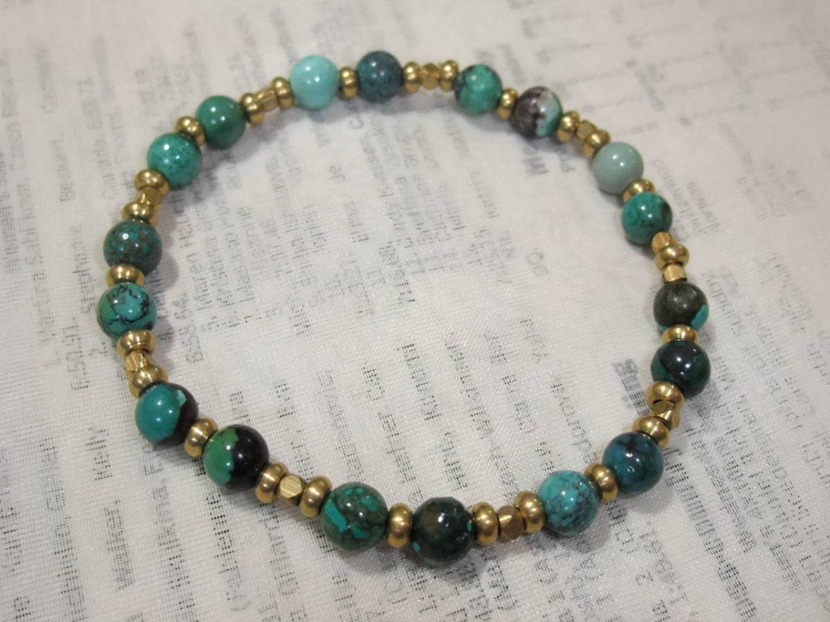 スパイダーウェブも♪真鍮と本ターコイズ本トルコ石ブレスレット☆スパイダーウェブの珠も色々入った丸珠のトルコ石と高品質な真鍮も☆69⑦