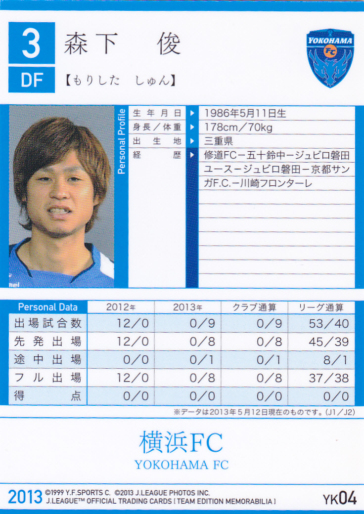横浜FC2013 YK04 森下俊 Jリーグオフィシャルトレーディングカード チームエディションメモラビリア 三重県 川崎フロンターレ