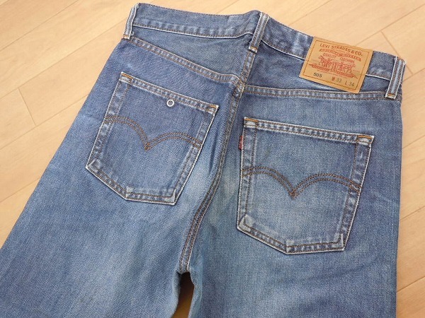 ●リーバイス505のジーンズです。あくまでも古着のため、ノークレームノーリターンでお願いいたします。使用感は、ございます。細かな擦れなどはございますが、着用に問題あるような致命的なダメージはないと思います。写真のように、バックポケットにスナップボタンが付けられております。古着らしい色落ちした、味の出た雰囲気です。裾はシングルステッチで、裾上げされており、擦れがございます。