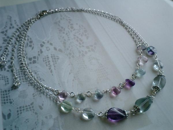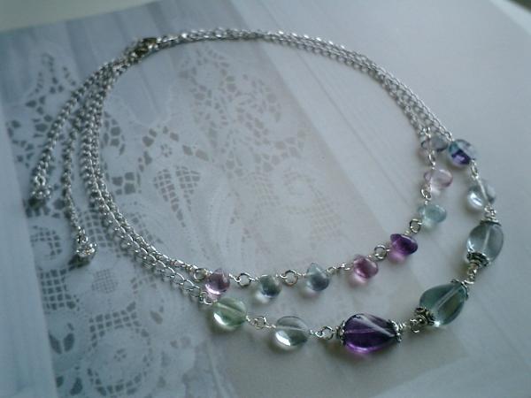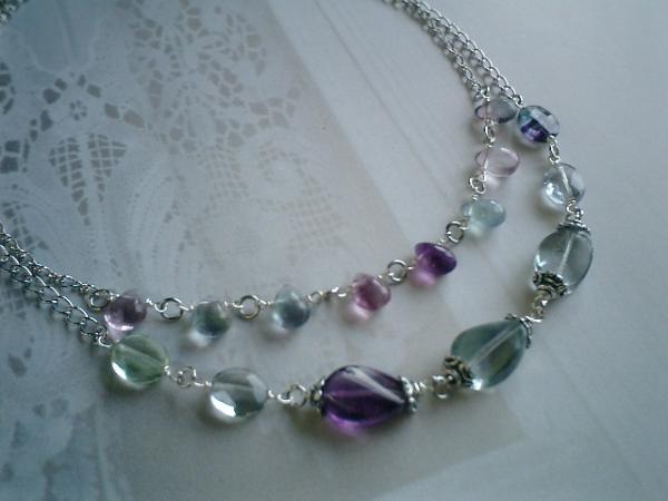 私らしくシリーズです♪小さな贈り物!!神秘的なフローライトのネックレス2点セットです♪いろいろな組み合わせでお楽しみ頂けます♪繊細なフローライトのドロップは10×8ミリ位です♪深みのあるお色はとてもシックです♪長さは全長52センチ位で調節自由です♪繊細なカットが美しいウエーブオーバルのフローライトは15×10ミリ位と10×8ミリ位のオーバルです♪座金でおめかししてさりげなくロマンチックしています♪長さは全長52センチ位で調節自由です♪2点ともシックで長く着けて頂けると思います♪お揃いのブレスレットも出品しています♪ハンドメイドをご理解頂いてノークレーム、ノーリターンでお願いします