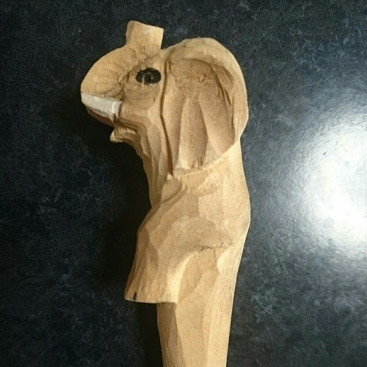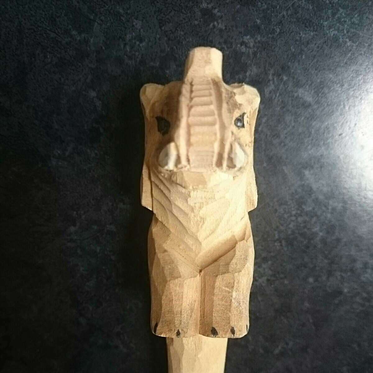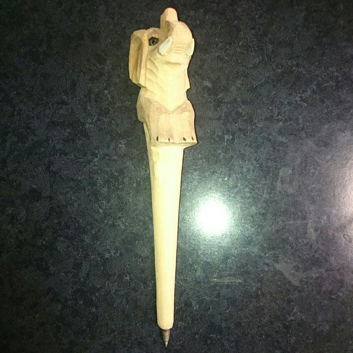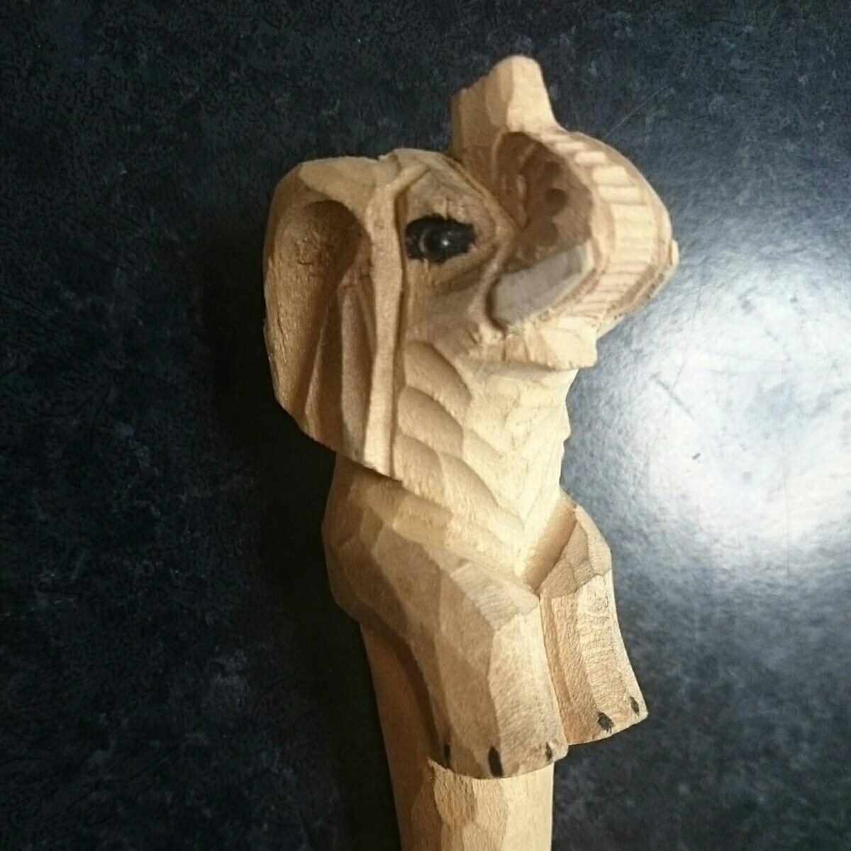 木製彫刻のゾウです。アンティークインテリアにぴったりだと思います。先がボールペンですが、インクは付きません。汚れなく良好なお品です。全長18cmです。