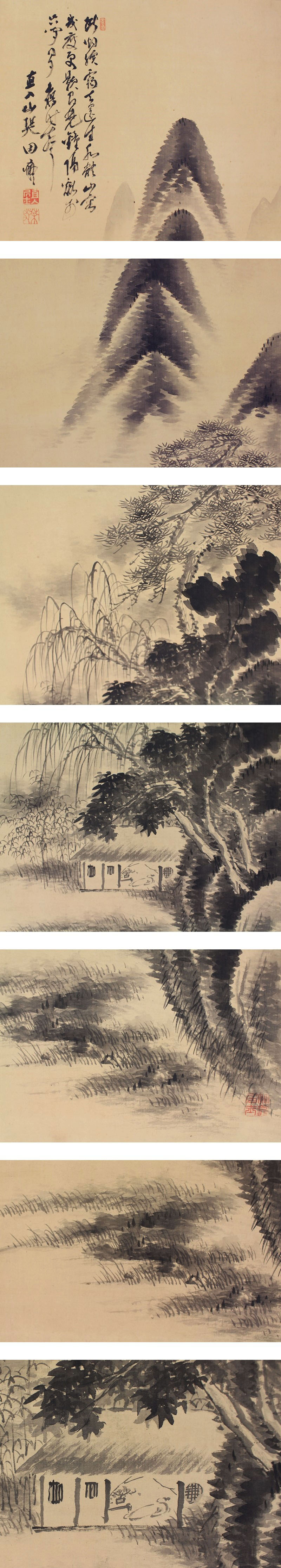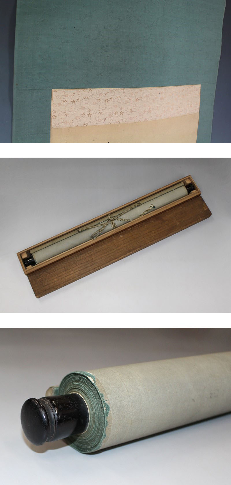 田能村直入 たのむら-ちょくにゅう (1814-1907) 南画家。豊後生。字は顧絶、初め小虎と号し、のち直入と称する。田能村竹田に学び、竹田にその才能を認められ養嗣子となる。南宗画学校を開くなど、南画壇の向上に尽力した。明治40年(1907)歿、94才。 本紙は、シミ、汚れ、シワ、ヤケがあります。 表装は、シミ、汚れ、折れ、シワ、スレ、ヤケがあります。 【サイズ】 作品 横約42.5cm×縦約130cm 表装 横約57.5cm×縦約206cm |