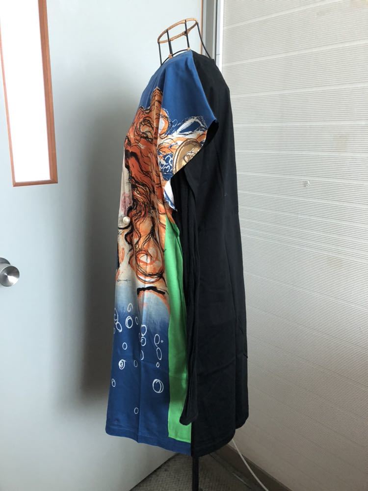 「中肉のコットン素材を使用した半袖ワンピース。海底に横たわる美女のまわりに妖精のようなダイバーが漂っている、今にも物語が始まりそうなプリントのアイテム。リアルで緻密に描かれた大きな美女の横顔はインパクトが強く、ゆるいタッチのダイバーとのコントラストがいっそう印象を引き立てます。服の中で体が自由に泳ぐようなリラックスしたシルエットです。」