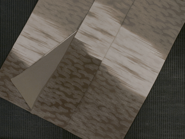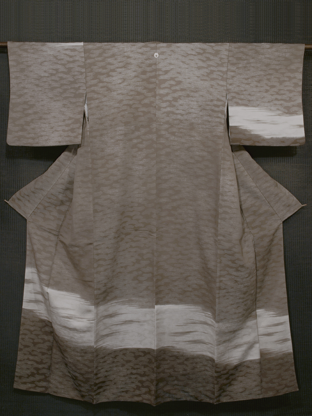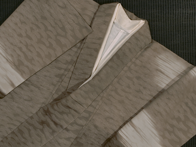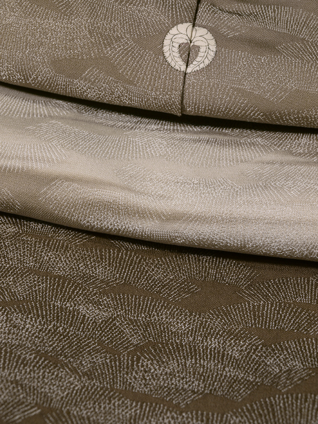 全体的な印象としては、やや淡い樺茶(かばちゃ)色、素色(そしょく)、淡い憲法黒茶(けんぽうくろちゃ)色で霞の文様があらわされた地に、地紙の地紋が織り込まれている御召縮緬の付下げ小紋です。袷仕立てで、きなり色の地に抽象的な地紋が織り出された紋意匠縮緬の重ね衿が縫い付いています。また、染め抜きで「下り藤」の一つ紋が付いています。 モダンな渋みと洗練されたシックさが感じられる美しいお色目です。なめらかでさらりとした手ざわりの上質な縮緬地です。御召縮緬の付下げ小紋はめずらしいです。一つ紋が入っているので、略礼装としてお召しになれます。 ユーズド品と思われますが、使用感は感じられません。しみやよごれ、褪色などのダメージも見あたらず、たいへんきれいな状態です。 |