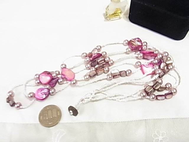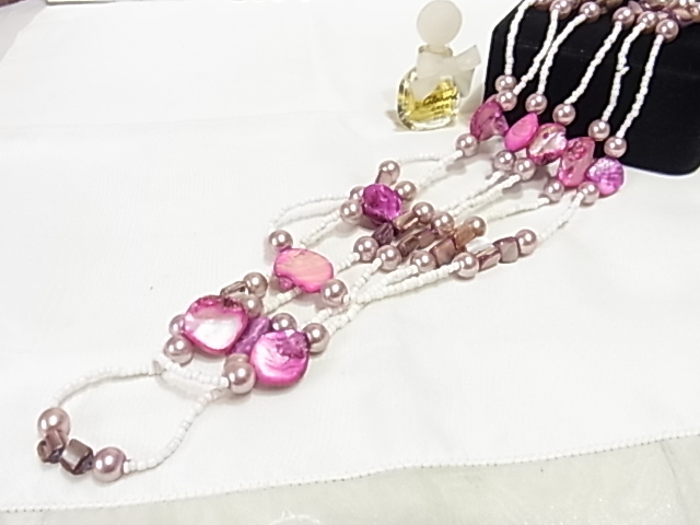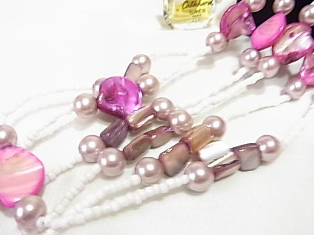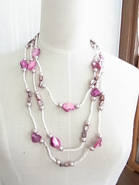 パール調ビジューにピンクのシェル調に白の小粒のビーズ使い 可愛い系 3連 ロングネックレス△△