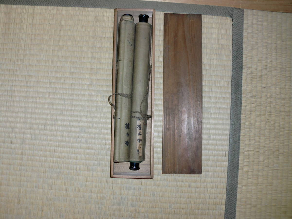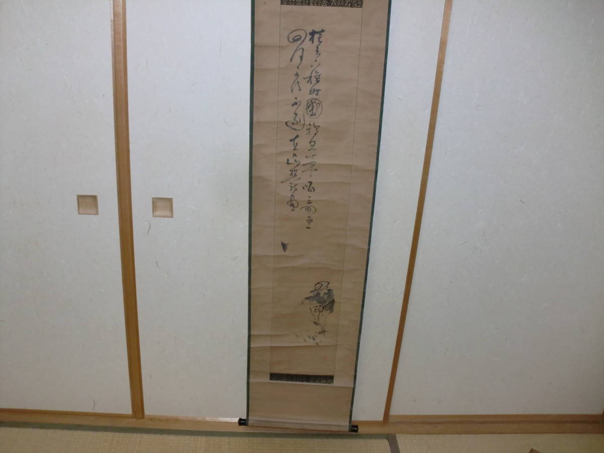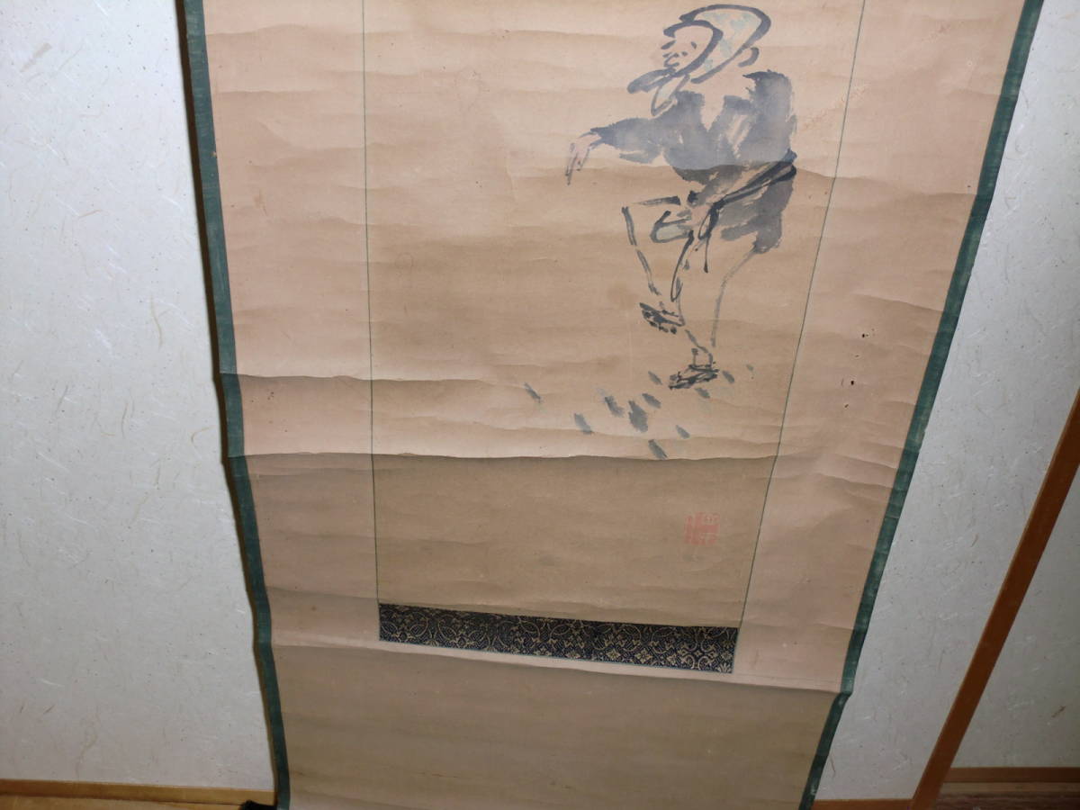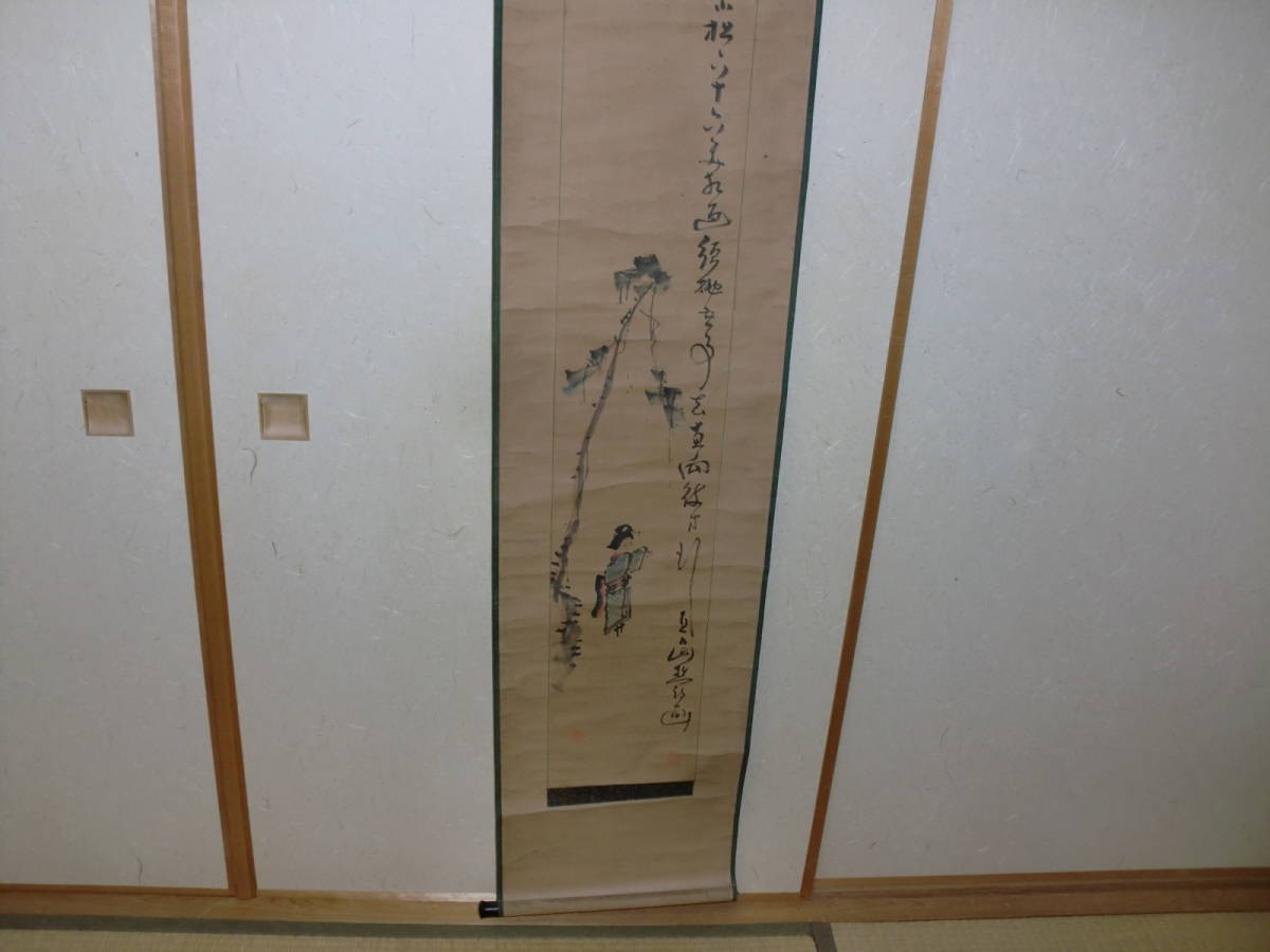 状態は、画像どおりですが、古ーい作品にて  権兵衛表装に一部切れ補修、全体に時代焼けはありますが、目立つ汚れ等のないアンテイークコンデションです。