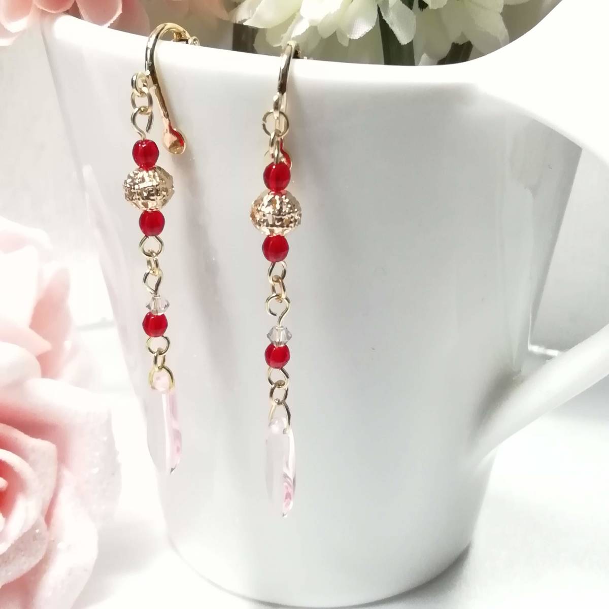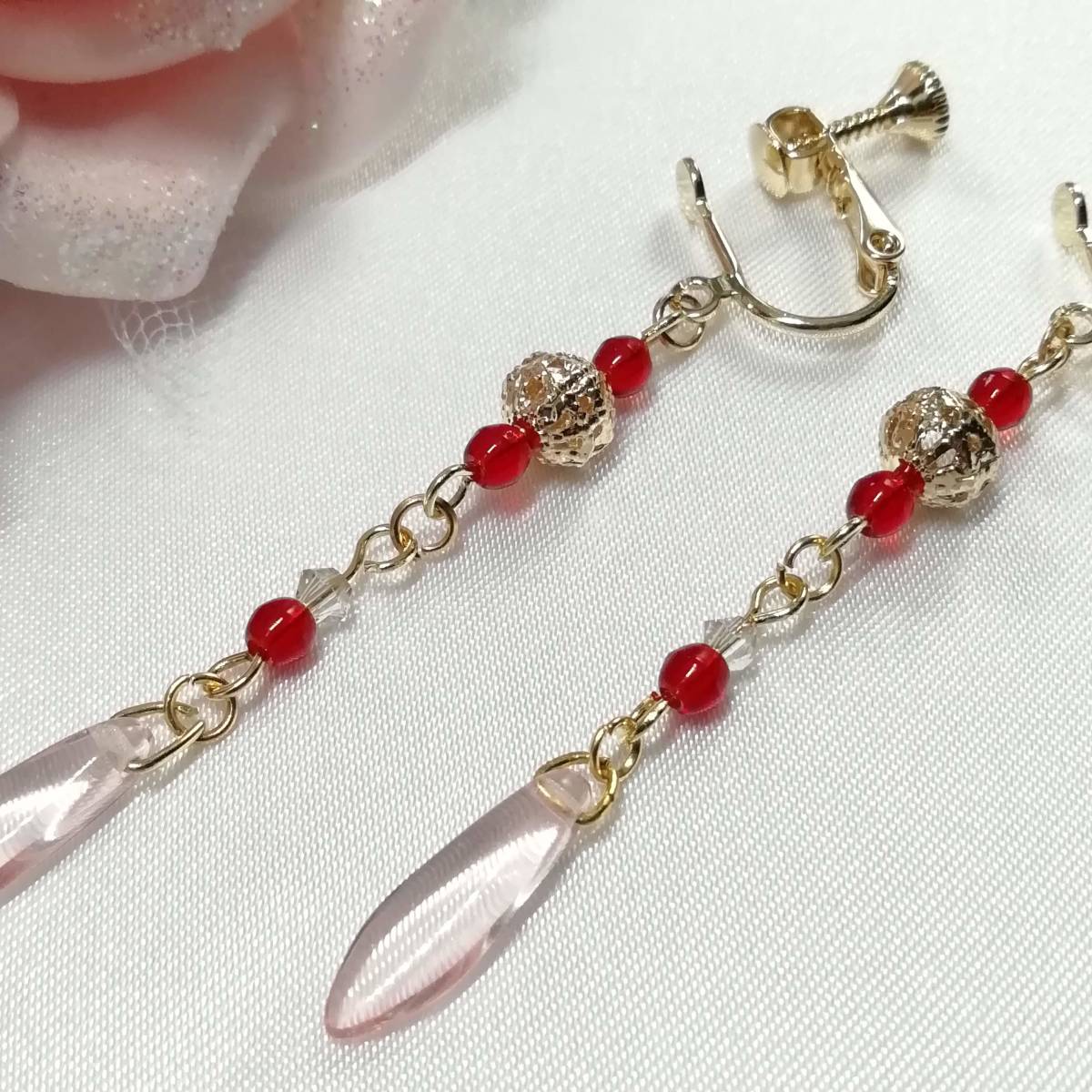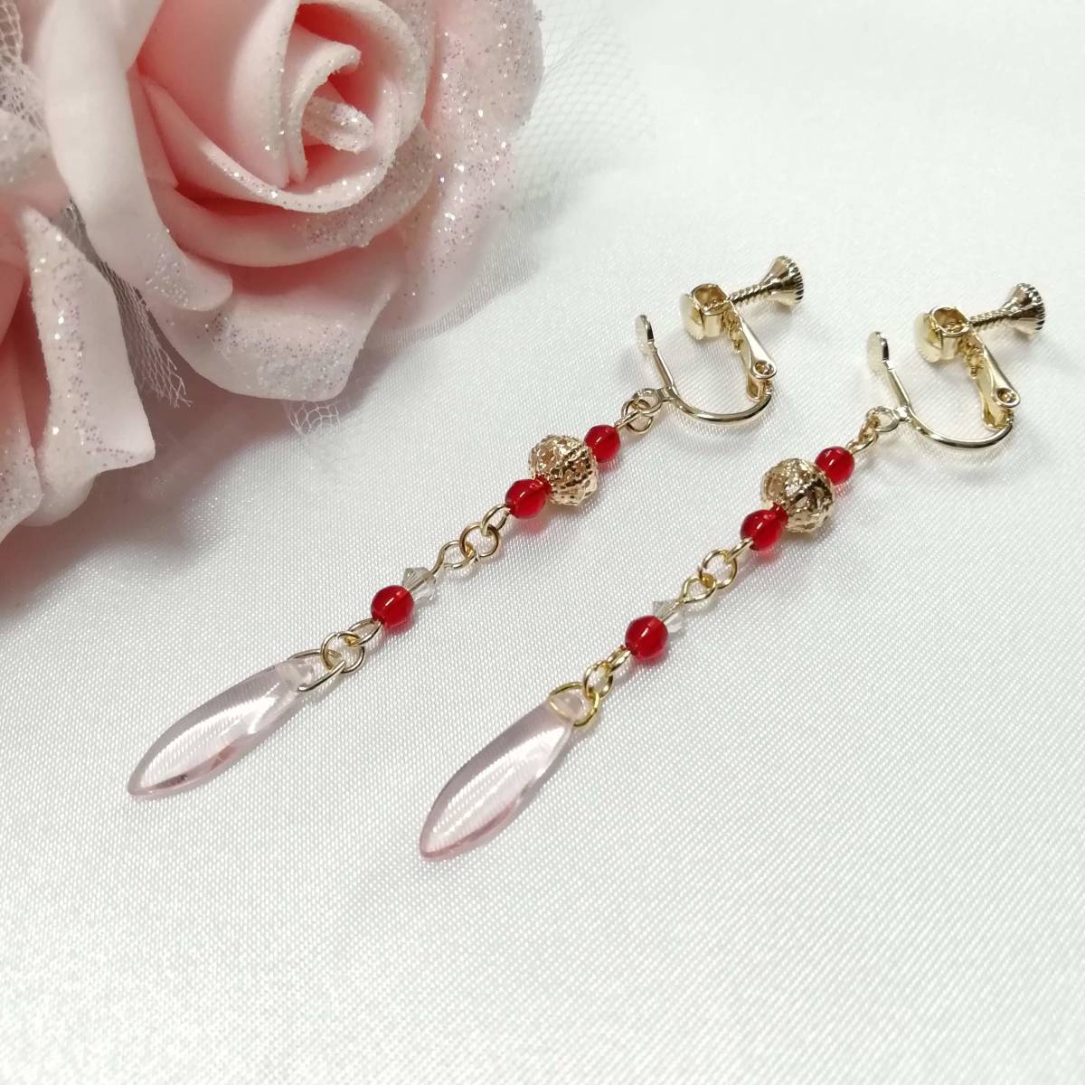 ★商品内容★ ★チェコビーズ薄桜色ダガーとシャムルビーのハンドメイドイヤリング★ゴールド・シンプル・上品・薄桜色・赤・クリスタル・透かしビーズ ゴールドを基調にした、 ゴージャスで上品な雰囲気のイヤリングです*・**。☆・*.・**.・ 吊る下げたダガービーズの透き通るような薄桜色が 可憐で優しい女性らしさを印象付けます**。・.*・**。☆・**.・*・**。 普段使いはもちろん、オフィスにも、 お出掛けやお洒落のワンポイントにも最適です・**.・☆・**.・**.・ 【素材】 透かしメタルビーズゴールド6mm チェコビーズダガーロザリン(チェコ産)16mmx5mm チェコビーズライトシャムルビー(チェコ産)3mm スワロフスキー5328クリスタSシェイド(オーストリア製)3mm カンより垂れ下がる長さは、約5.3㎝です。 Eー458 ★商品状態★ ・画像と実物の色味が多少異なる場合があります。 ・緩衝材(プチプチ等)を使用し、防水梱包でお届け致します。 ★注意事項★ ***~ご購入前に必ずお読み下さい~*** ***商品について*** *一点一点心を込めて作っておりますが、手作りなため多少の歪み等あるかもしれません。 手作りの味わいと、世界で一つだけの作品とお考えいただければ幸いです。 *デリケートな商品ですので、強く引っ張ったりすると破損する事もあります。 お取り扱いにはご注意ください。 *写真も完璧な色合いの表現にはなっていない場合もあります。 *基本イヤリング金具は跳ね上げ式ネジ付きを使って作成しています。 ご希望によりピアスへの変更も承っております【フックピアスへの変更(無料)/キャッチピアスへの変更(追加料金120円が必要です)】 ~ご注文の際にメッセージ欄よりお申し付けください~ 尚、金具変更のご希望が無い場合は、掲載された写真の金具にてお送り致します。 *金属アレルギーや化学物質アレルギーなどへの対応はしておりませんので、ご心配な方はご遠慮下さいますようお願い致します。 *永くご愛用頂くために、ご使用後は柔らかい布等で軽く拭いてください。 ***ご質問について*** *ご購入前にお願い致します。 日中は仕事をしておりますので、ご返事が直ぐに出来ない場合がございます。 出来る限り早い対応を心がけますが、ご了承ください。 また、発送までには、お振込み確認後、翌日の発送を心がけておりますが、仕事の都合により2~3日程かかる場合がございます。(その際にはナビにてご連絡いたします) お急ぎの場合は、極力対応いたしますが、場合によっては対応致しかねる事もあります。ご了承下さいませ。 落札後4日以内にお手続き、ご連絡が無い場合は落札者都合で削除致します。 発送日指定・ご入金の予定が1週間以上先をお考えの方は、入札の前に質問よりご連絡くださいませ。 予めご了承の上、ノークレーム・ノーリターンでお願い致します。 | |||
