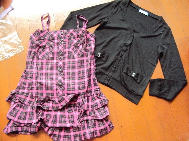 未使用品です。カーディガンとワンピースのセットです。サイズは160です。お色は、ワンピースがピンク×ブラックのチェック、カーディガンはブラックです。素材はポリエステル65%綿35%です。自宅保管品ですので神経質な方は御遠慮下さいね。ノークレームノーリターンでお願い致します。その他いろいろ出品していますので見て下さいね。必ず自己紹介も御覧下さいね。