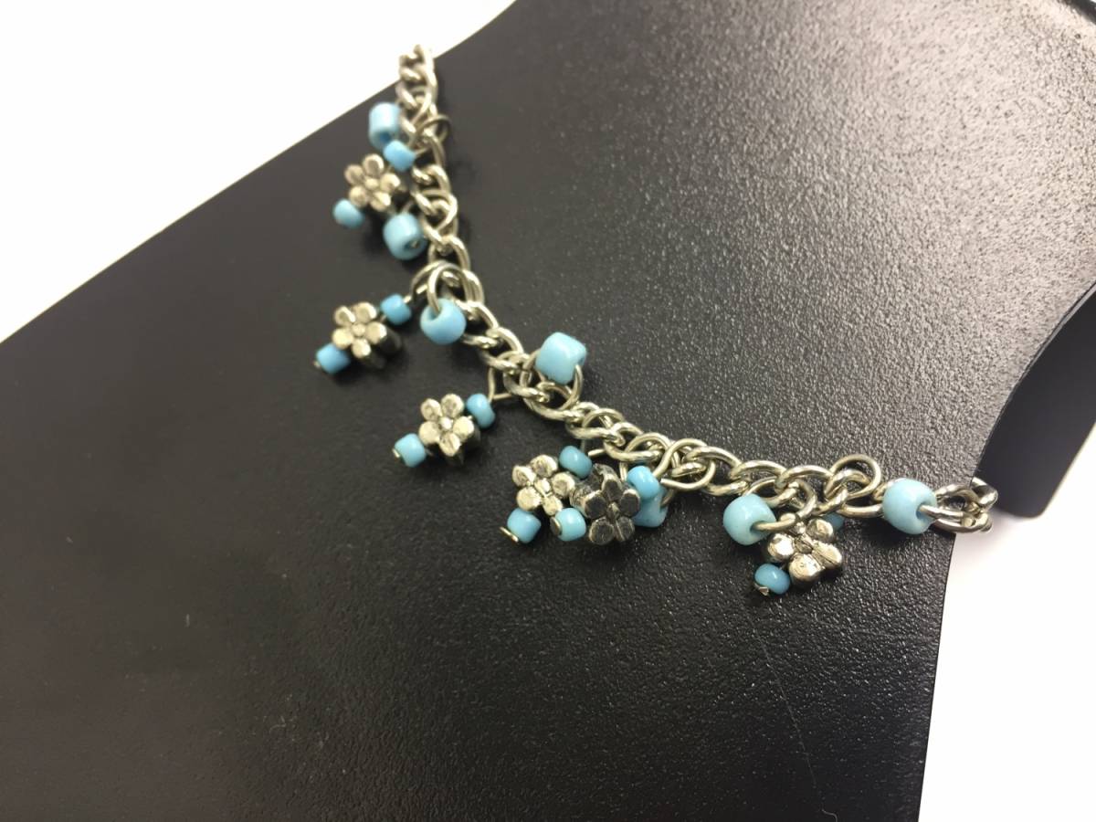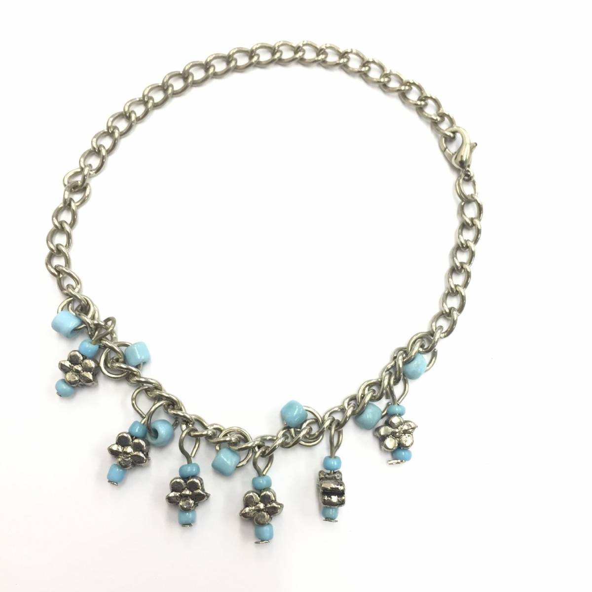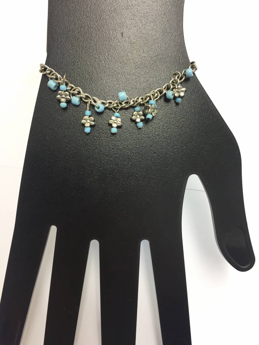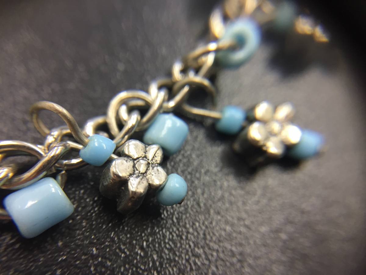水色のビーズと銀色の花が爽やかな印象のブレスレットです。