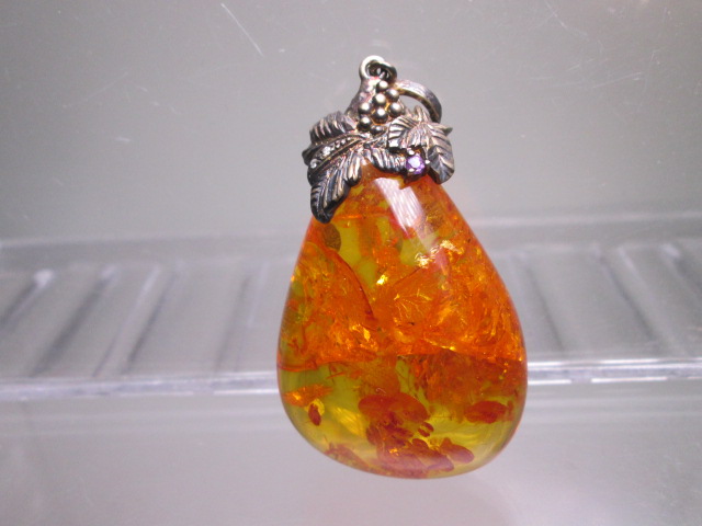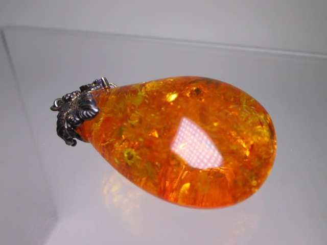 ☆彫金細工 葡萄文 アメジスト飾り天然琥珀のペンダントトップ