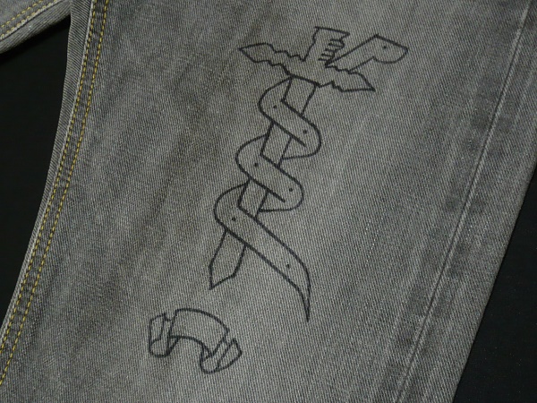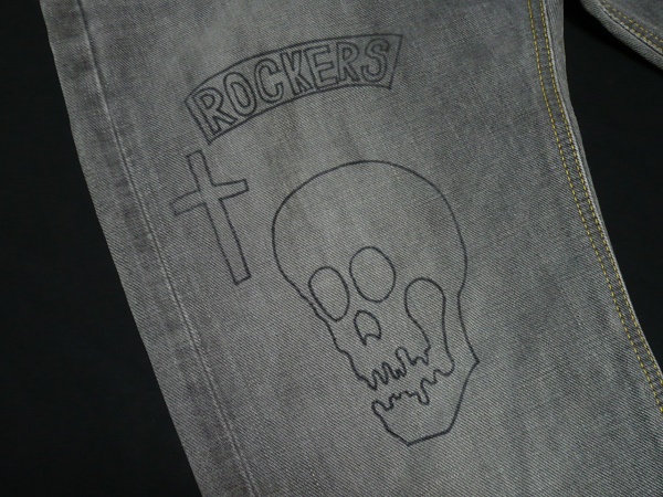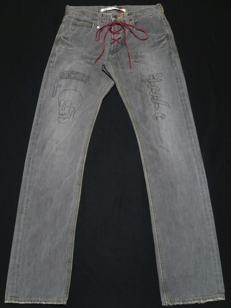 Lee・リーのLeeSHOP限定販売のライダース・パンツのカスタム・モデル「ROCKERS RACE UP RIDERS PANTS」のサイズSMALL(W29前後相当)になります。カラーはブラック・デニムにユーズド・ウォッシュ加工を施し色落ちさせたグレーになります。(品番04024)。「101Z RIDERS」パンツをベースにユーロ・カフェ・レーサーのデニム・パンツをイメージして製作されたロッカーズ・スタイルのカスタマイズド・モデルで、シルエットはまた上やや浅めの細身に仕上げたタイト・ストレート、素材はセルビッチ付(白耳)ブラック・デニムでフロントはジップ・フロントでジッパーはUNIVERSAL製ピン・ロック(片爪)ジッパーを使用、フロントに赤黒のロープ・コードで編み上げるレース・アップ仕様でポケット・スレーキはグレーXブラックのブロック・チェック生地が使用されています。トップ・ボタンは「Lee RIDERS」刻印、ヒップ・ポケットのレイジーSステッチは高めに設定されています。右腿に「ROCKERS」の文字と「スカル」、左腿に「スネーク&ソード」の紋章がプリントされています。)。ユーロ・ロッカーズ・スタイルをヴィンテージな雰囲気と現代的な細身なタイト・ストレート・シルエットで再現したLeeSHOP限定のオリジナル・カスタム・モデルとなります。腰内側に「LEE RIDERS」のネーム・ラベルと十字架を描いたネーム・ラベルがクロスする形で縫い込まれています。状態は元々ユーズド加工が施されたモデルで全体にヴィンテージな使用感がある仕上がりになっています。実際の着用による使用感の少ないきれいな状態で色落ちしたグレーですがシミやヨゴレも無く、着用によるアタリやスレなども無く非常に良い状態になると思います。グレー地の為、出品に際して軽く水洗いしてあります。実寸はウエスト約76cm(平置き)約38cm、股下約87cm(裾上げ未処理)、裾幅ワタリ約30cm、裾部約19cm、股上約25cmとなります。(素人採寸ですので多少の誤差はお許し下さい)。素材表記は綿100%。日本製。すでに販売が終了した未だにマニアックな人気を誇るLeeショップ限定の企画モデルで現在では非常に入手の困難なレア・モデルになると思います。 | |||