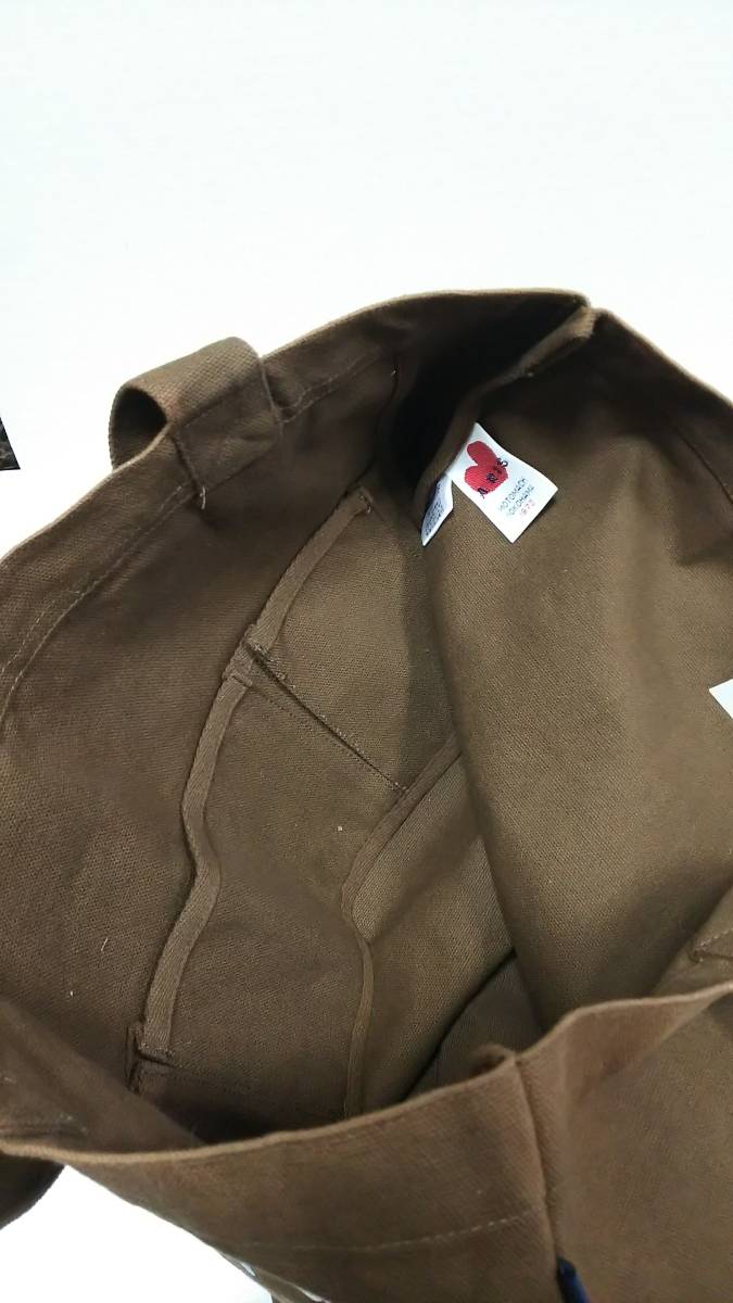 大きさは、約40cm×45cm×マチ14cm。 綿100%です。