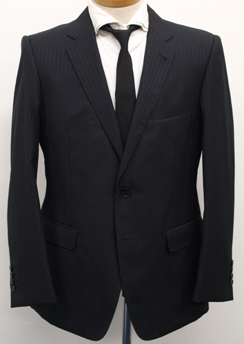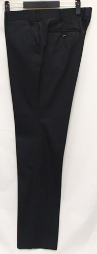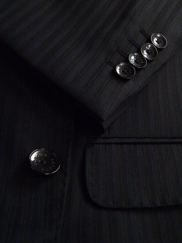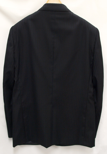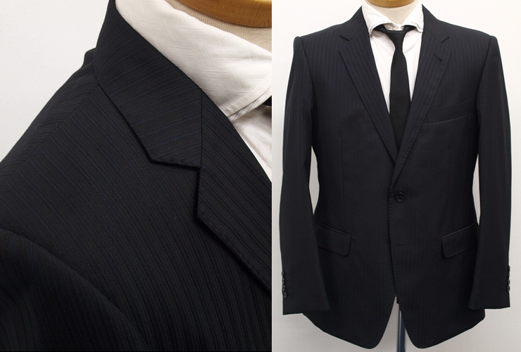 【サイズ】 BB5(BBM/BE5号相当) 目安の体型 身長165cm~175cm、ウエストサイズ94cm前後 【ジャケット実寸】 肩幅45.5cm 着丈71.5cm 袖丈61.5cm 脇下部分52cm 身幅50cm 【パンツ実寸】 ウエスト(胴回り実寸)94cm (平置きでかるくはかると94cmでひっぱってはかると98cmです。股上が浅いため実寸が3~4cmほど大きめに作られております。) わたり幅33cm(股下10cmの部位で30.5cm) 裾幅20.5cm 脇股上24cm 前股上25.5cm 股下87cm(裾上げしていない状態/新品) 【素材】 表地:ウール(毛)76% ポリエステル24% 裏地:胴裏/ポリエステル100% 袖裏/ポリエステル100% あまり厚手ではない秋冬向けの紳士スーツ用ウールブレンド素材を使用。 【色】 黒色 【柄】 コードストライプ織柄のはいった黒色地に青色のラインが9mm間隔ではいったストライプ柄 レーザーブライト加工をほどこしており光のあたりかたによりやや艶感がでます。 【デザイン】 コンパクトな印象の細身シルエット、タイトフィットスリム、ビジネススーツ新品、裾上げしていない状態です。 ・ジャケットはシングル2つボタンでスリムモデル ・パンツは股上が浅く細いシルエットのノータックスリムパンツ 秋~冬~春先にかけて秋冬メインのシーズン対応商品 ブランド名 renoma 【縫製仕様】 ・ジャケットはシングル2つボタン、ノッチドラペル、襟縁等AMFステッチ入り、袖口ボタン4つ、センターベント、内ポケット4つ(小ポケット2つ含む)、総裏(秋冬シーズン対応) ・パンツはノータック、膝裏当て付き、脇ポケット斜め付け、後ろポケット両玉縁で右、左ともにボタン付き、フロントはファスナーでボタン&ホック仕様/うちかけボタンあり 細部にわたりきちんとしたきれいな縫製仕立てで仕上がっております。