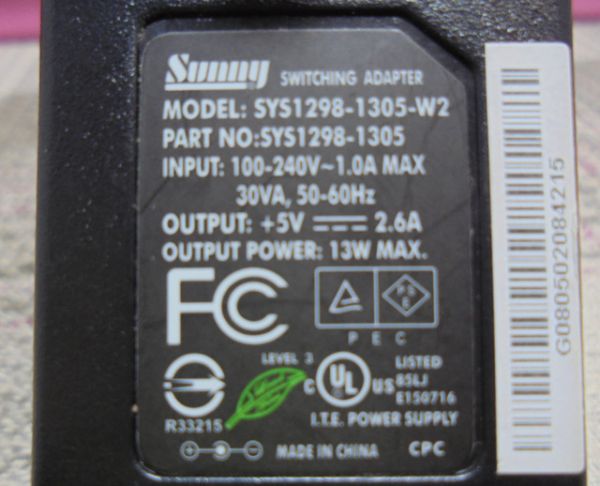Sunny SYS1298-1305-W2(スイッチング)【ACアダプター DC 5V/2.6A センタープラス】/ジャンク