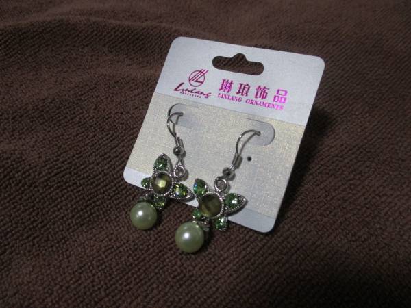 蝶のようなシェイプにグリーン系の石でまとめグリーン系パールの部分が揺れてとても可愛らしいピアスです。