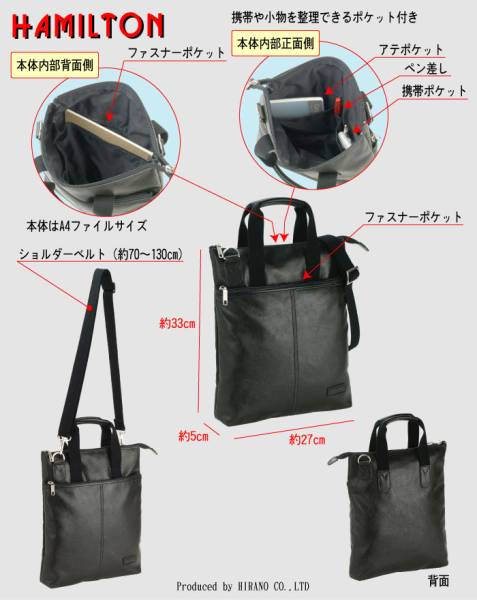 | ★HAMILTON ハミルトン 【バッグインフォメーション】 ◆サイズ : 横幅27×高さ33×厚み5センチ ◆素 材 : 合皮 ◆カラー : (01)クロ ◆本体正面 : ファスナーポケット ◆本体内部 : ファスナーポケット、携帯ポケット、ペン差し、アテポケット ◆その他の仕様 : 底板、ショルダーベルト付き ◆重 量 : 約410g ◆生産国 : 日本 ※ 予告なく仕様変更する事がありますのでご了承下さい。 この商品を購入された方のコメント ・2wayの縦型トートを探していて、この商品を見つけました。サイズもちょうどよく、これから使うのが楽しみです! ・イメージ通りの商品で、最高に気に入りました!見た目、大きさなどまさに求めていたモノでした!軽さもいい感じです。 | |