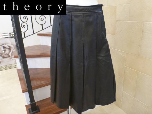 7万 セオリー(Theory) 黒 ブラック 羊革 本革レザー ラムレザー プリーツスカート 2 M相当