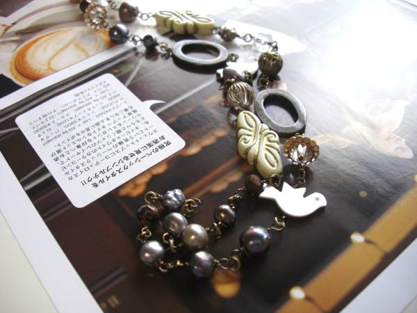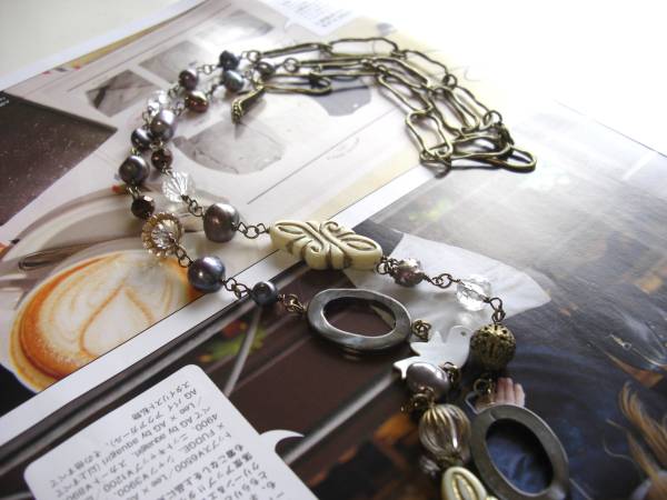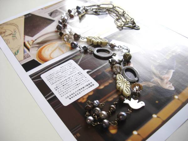 シックに華やかに・・シリーズです♪物憂げな小鳥さん・・個性的なバロックの淡水パールのネックレスです♪淡水パールは6ミリから9ミリ位までのポテトやバロックなどデザイン違い、大きさ違いを集めました♪黒蝶貝の小鳥さんやリング、ドイツビーズや樹脂ビーズ、デザインチェーンを合わせてアンティークな表情です♪長さは全長110センチ位で調節自由です♪2連にしても素敵です♪シンプルでいつまでも着けられるデザインを考えて作りました!お揃いのブレスレットやピアスも出品しています♪ハンドメイドをご理解頂いてノークレーム、ノーリターンで お願いします