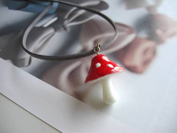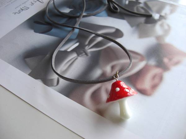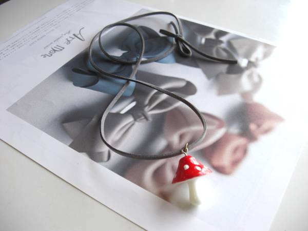 秋色・テキスタイル・・シリーズです♪小さなキノコさん・・可愛い小さなキノコさんのネックレスです♪チャコー ル・グレーのスェード紐を合わせたネックレスのキノコさんは34×24ミリ位です♪長さは全長75 センチ位で調節自由です♪お揃いのイヤリングも出品しています♪シンプルでいつまでも着けられるデザインを考えて作り ました!ハンドメイドをご理解頂いてノークレーム、ノーリターンでお願いします