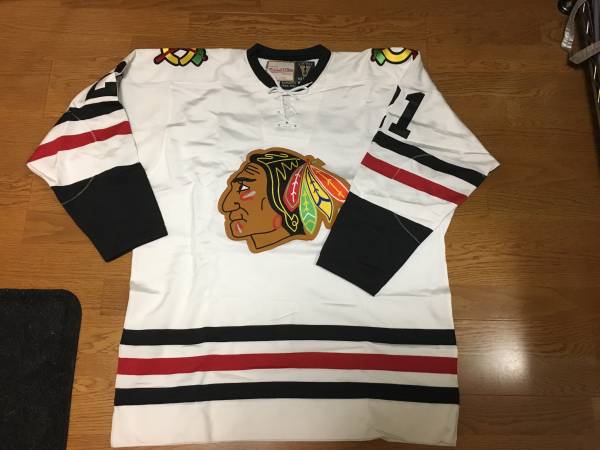 mitchell&nessのNHLのシカゴブラックホークスのジャージーです。  もちろん、本物です。フィラデルフィアの本社から購入。  やっぱりオーセンティック(本物仕様)は、素材から違います。選手名も伝説の選手なので自慢できると思います。   サイズ56。