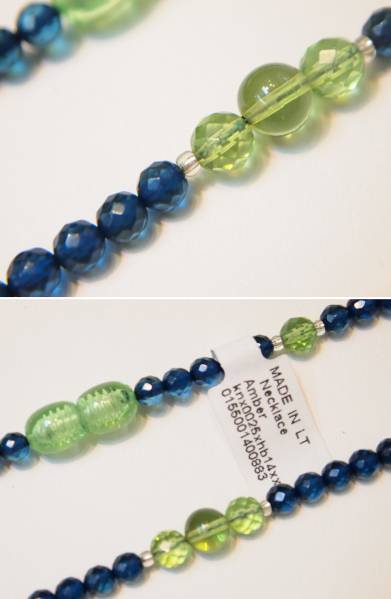 リトアニア製 ブルー&グリーン 天然コハク マルチカラー ロングネックレスです。