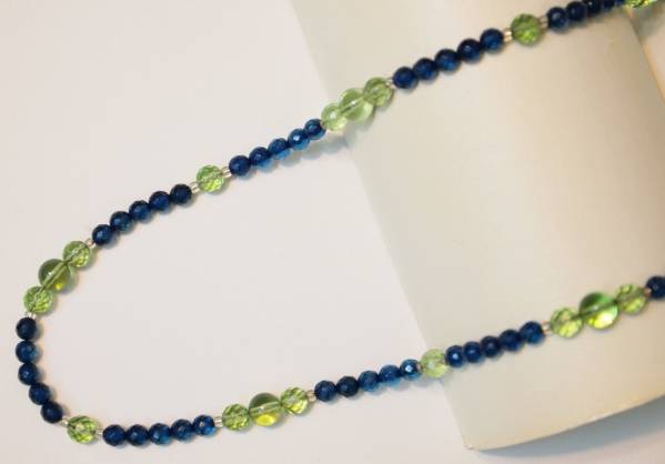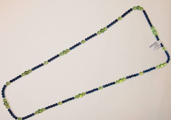 天然コハクに加熱処理などでブルーやグリーンに着色加工を施し、美しい色合いに仕上げたロングネックレスです。