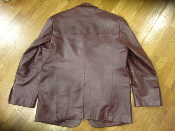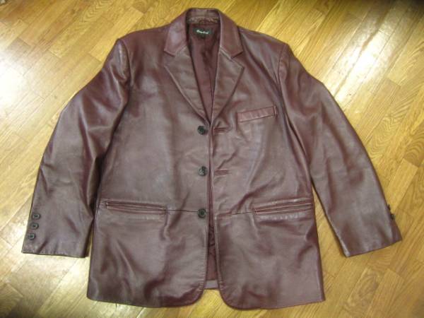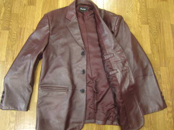 レザージャケットです。色は茶です。 「Bay Leaf」とあります。羊革です。サイズ表記Lです。実寸より判断下さい。肩幅約49cm、袖丈約60cm、着丈約73.5cm、身幅約54cmです。一点、フロントの真ん中のボタンが割れています。(一般的な黒のボタンですので、探し安いものだと思います。)使用回数も少なく、比較的きれいなものだと思いますが、中古品に付き、神経質な方は入札をお控えください。ノークレーム・ノーリターンでお願いします。発送は、ヤフネコパックを予定しています。