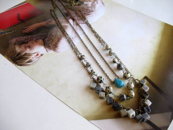 シベールの宝石箱・・シリーズです♪私的・スタイル・・キュートなジャスパーやダルメシアン、ターコイズのネックレス3本セットです♪個性的な素材を集めてニューヨークテイストなデザインです♪色々な組み合わせや単品でも楽しんでいただけます♪ダルメシアンは6ミリ、8ミリの丸玉、ジャスパーは7ミリのキューブです♪ターコイズは12×9ミリ位のペアシェイプです♪ダルメシアンのネックレスは70センチ+アジャスター10センチで全長80センチ位です♪ジャスパーのネックレスは74センチ+アジャスター10センチで全長84センチ位です♪ターコイズのネックレスは48センチ+アジャスパー10センチで全長58センチ位です♪お揃いのブレスレットやピアスも出品しています♪ハンドメイドをご理解頂いてノークレーム、ノーリターンでお願いします
