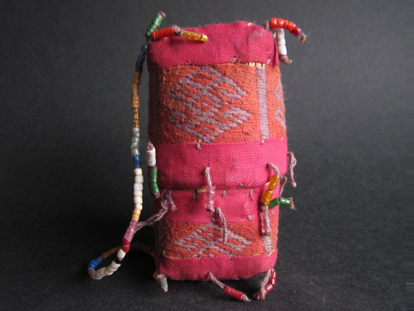 バンブーにテイモールの古い刺繍布とビーズを巻き付けた味わい深い品です。