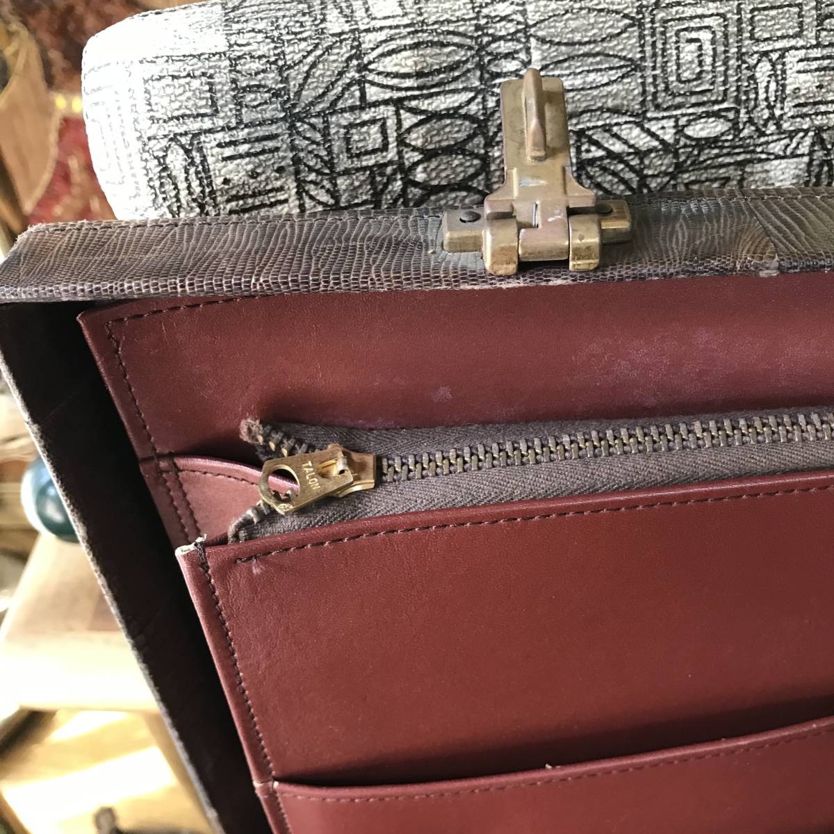 ★アメリカのアンティークショップで購入しました本物のリザードを全面に使用した豪華なアタッシュケースです。 型押しではなくオリジナルのリザードになります。探しても滅多に出てこないレアなアイテムです。持ち手には多少の革のはがれはありますが、それ以外は特にダメージも無く良好な状態です。ただし半世紀以上前のものですので経年による汚れなどはありますのでご了承下さい。内部のポケットにはTALONジッパーが付いてます。金具にはUS PAT・・・と刻印が入ってます。底面には4本の金属脚が付いてます。 サイズはおおよそ45cm×30cm×10cmあります(一般的なサイズです)。 アンティーク品、ヴィンテージ品にご理解ある方よろしくお願いします。