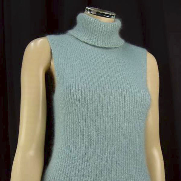 特徴:ふんわり煌めきラメ入りモヘヤ53%混!!素敵なノースリーブニットです。ミントブルー系の優しい風合い♪伸びよいリブ仕立てのハイネックニットです。 ---↓ここにサイズ記入----