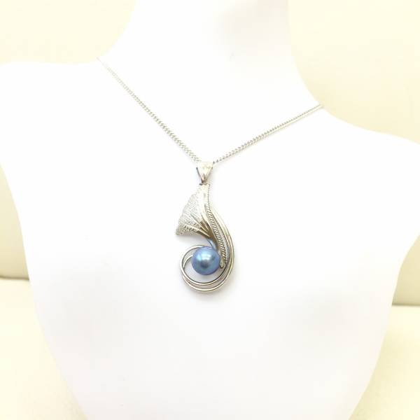 パールは約5mm玉。色はブルー系に見えます。葉っぱのような流線的なデザインが素敵なアクセサリーです。