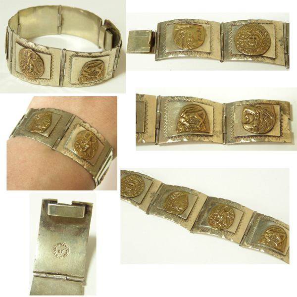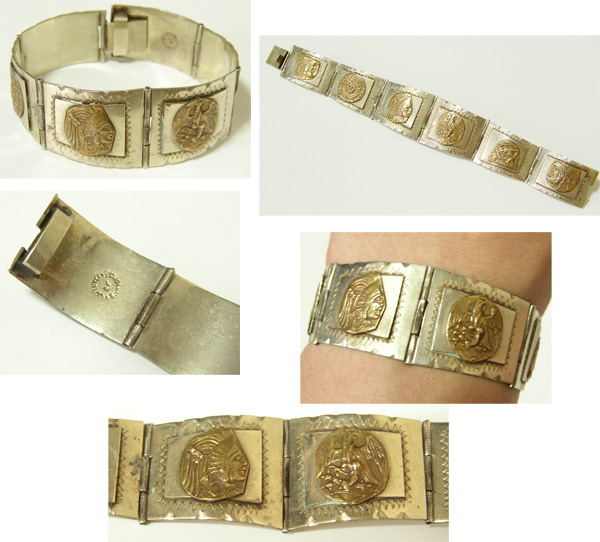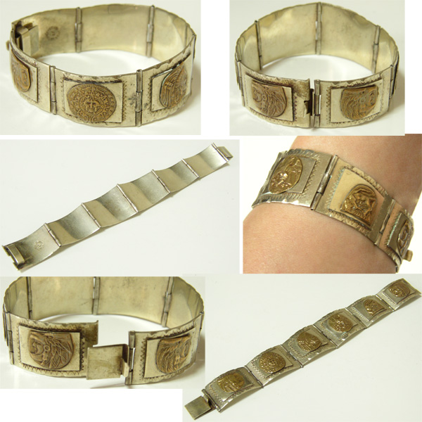 ヴィンテージ メキシカンブレスです。状態は、古い物ですので、経年による擦れや薄汚れなどありますが、ビンテージの雰囲気ある物です。アメリカで購入しました。イーグル仮面のアステカの曹長や文様など凝った作りです。内に印があります。素材は、シルバーでは御座いません。古い物ですので、状態はそれなりですが、年代物の風格とレトロ感ある珍しい物です。全体の長さ18cm、最大幅2.4cm、金具を留めた状態の内周りは、17cmです。ビンテージ物とご理解頂いて、ノークレーム、ノーリターンでお願いします。