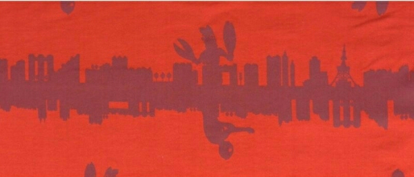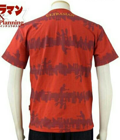 ウルトラマンとバルタン星人が街中で対峙する緊張の瞬間がボーダー柄になっている。緊張感あるシーンのはずが、ボーダー柄として配置されることで、どこかユーモラスに見えてしまう不思議な1枚です。