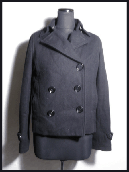 USED品正規品(ポイント)のローリーズファーム(中国製)の黒色の本体、表地;毛80%・ナイロン20%、裏地;ポリエステル100%、取り外し可能なライナー表地・裏地;ポリエステル100%のジャケットです。