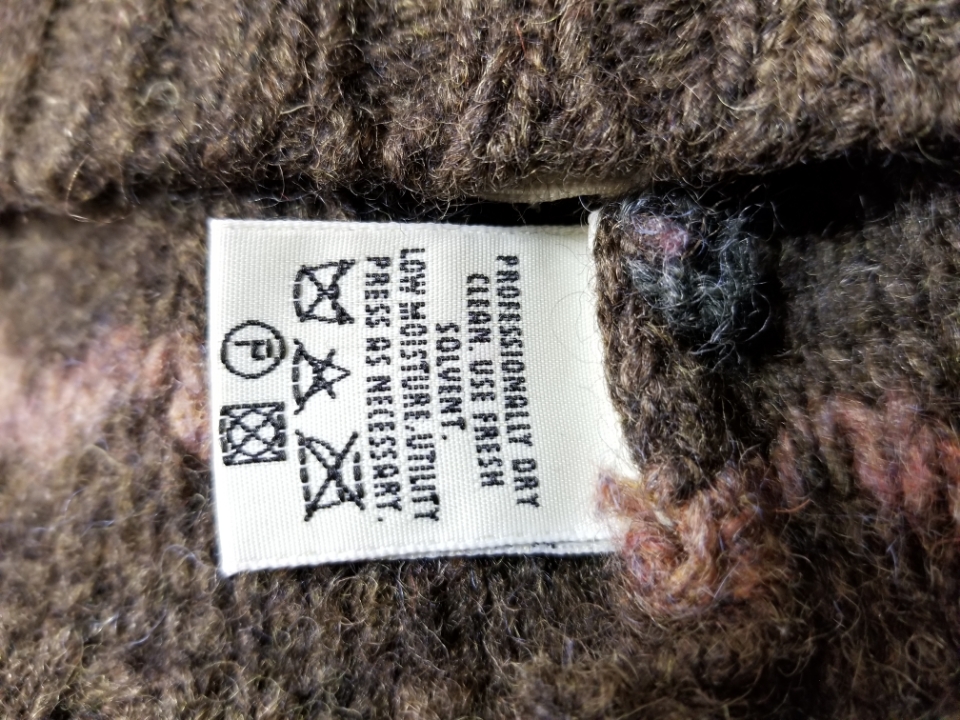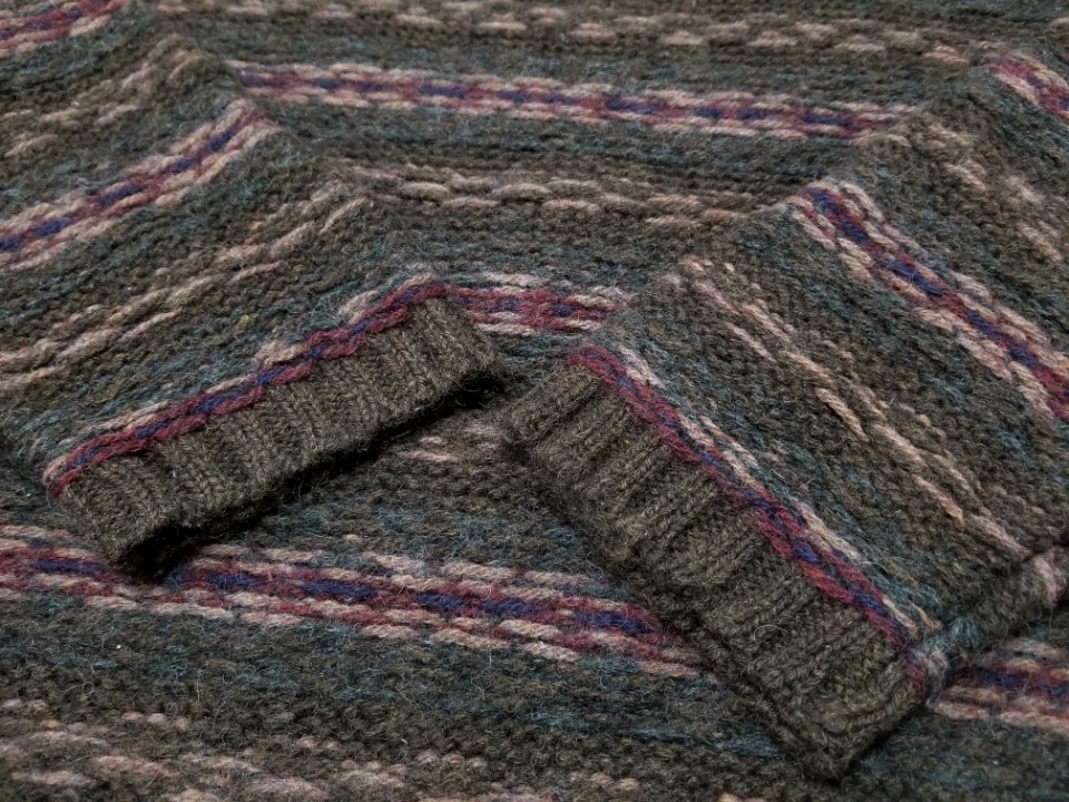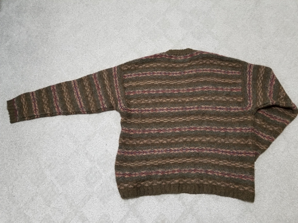 100%ウールの糸を使用しており、綺麗な柄の変わった編み目のしっかりとした作りの一着です、サイズ表記はXLですが少し大きめの作りです。