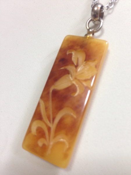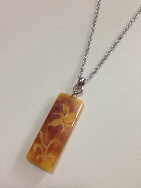 鼈甲張の花模様の美しいペンダントネックレスです、サイズは45×18ミリ、チェーンの長さは60センチのロングタイムです