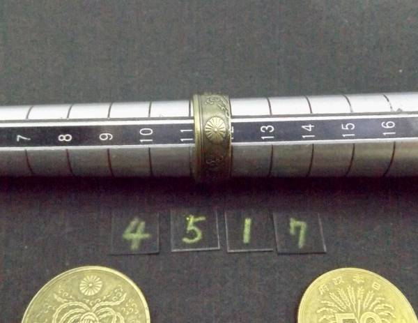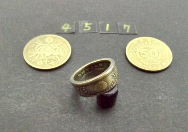 この商品は、昭和21年発行の 大型50銭黄銅貨を使用し、貨幣に穴を明け木槌で叩いてリングに成形した1点ものです。