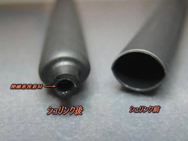 高収縮率 熱収縮チューブ 黒 内径9mm 長さ20cm 一般のヒシチューブと違い、径方向の収縮後サイズは約3分の1と高収縮ですので、段差のある防水処理などにも大変便利です。 チューブ内面は熱融着の接着材が施されていますので、防滴効果も高く難燃性も兼ね備えています。 収縮温度は約100度、ヘアードライヤー、ヒート・ガン、台所のコンロの炎でも簡単に処理できます。 この商品は、一般での入手が大変困難なものとなっております。 収縮前内径: 9mm 収縮後内径: 3mm 厚さ: 約1.3mm(収縮後) 長さ: 20cm(多少誤差が出ます) 軸方向収縮:0~10%(シュリンク物との状況により) |