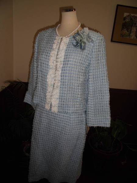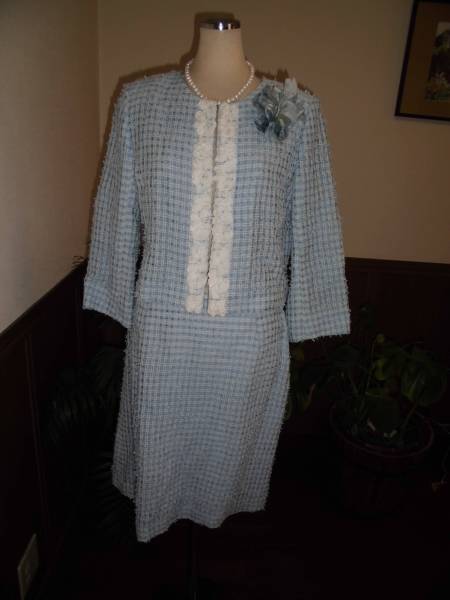YUKI TORIIの高級感溢れる爽やかでノーブルなブルーの春物ツイード調スーツでございます。格子状にりぼん糸が織り込まれております。ジャケット前たてにはリボンで型どられたお花がびっしりと施されております。さりげないお色目に流石プレタならではの技ありの逸品で上品な高級感がございます。素材は綿46、レーヨン34、ナイロン20%でございます。上品な趣と質感がございます。こちらのお色でございましたら年齢を問わずお召頂けるかと存じます。気の置けないお集まりや宴席の際春夏のスーツとしてお召いただける逸品かと存じます。上質をお好みのマダムにはお奨めのお品でございます。お顔映りの良いお色とデザインはひと目でプレタと見て取れるノーブルなお感じのスーツでございます。定価は上下で13万280円(税込み)でございます。おサイズは11号。おサイズの詳細はジャケットの肩幅38、身幅47、袖丈48、着丈48、スカートのウエスト72(ヒップボーン)、ヒップ100、スカート丈56でございます。(素人採寸ですので若干の誤差はお許し下さい)