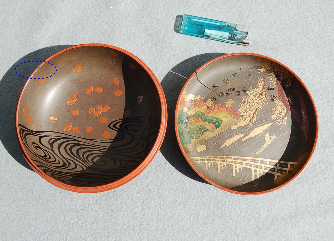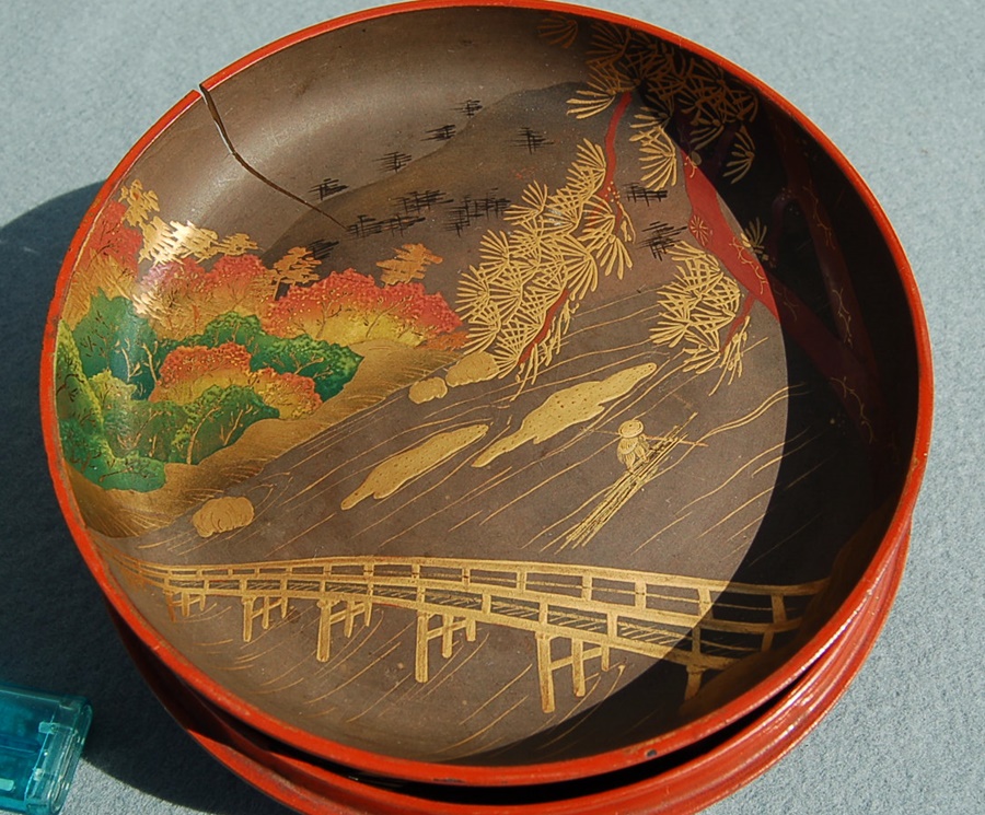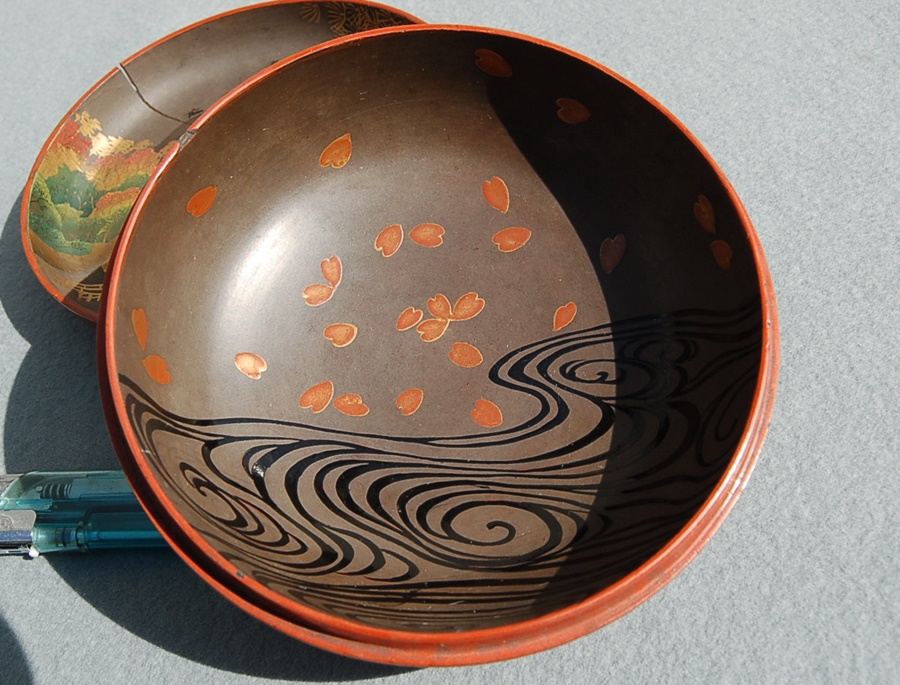 朱塗り 木製 蓋付:菓子鉢・松竹梅  中:蒔絵 流水紋に桜 金彩色絵:山水画