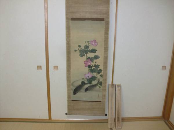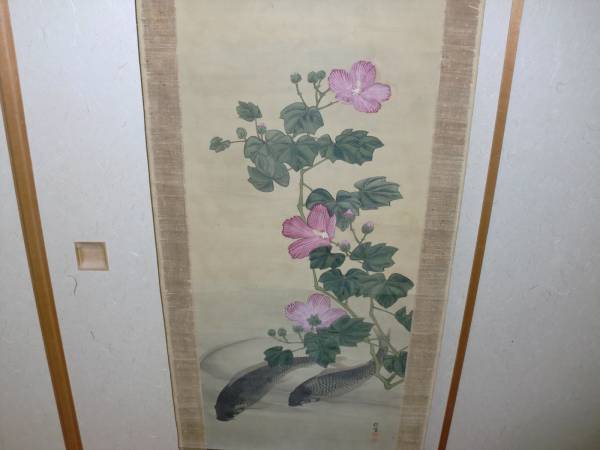 【模写】 掛軸 幸野楳嶺 トテモ重厚緻密で気品のある双鯉と芙蓉圖 絹本 木箱