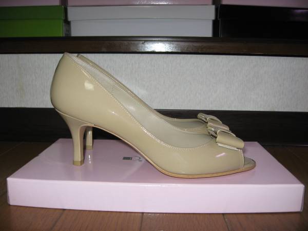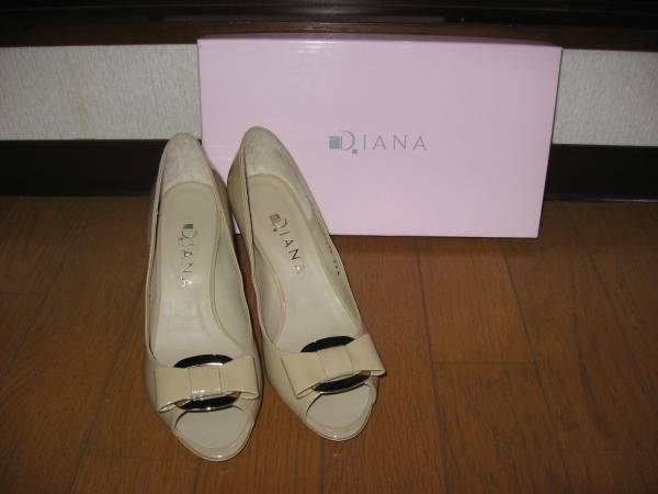 ダイアナの甲リボンオープントゥパンプス(新品)です。お色はベージュ系、パテント(エナメル)素材です。表記サイズは22.5cm、ヒールは約6.0cmです。甲のリボン(お取り外しは出来ません)が素敵なパンプスです。室内での試着のみの新品です。※ご入札ご希望の方は、当方の自己紹介欄をよくお読みの上、ご入札下さいませ。落札後のキャンセルはご遠慮下さい。ノークレーム、ノーリターンでお願いします。他にも色々と出品中です。よろしければご覧下さい。